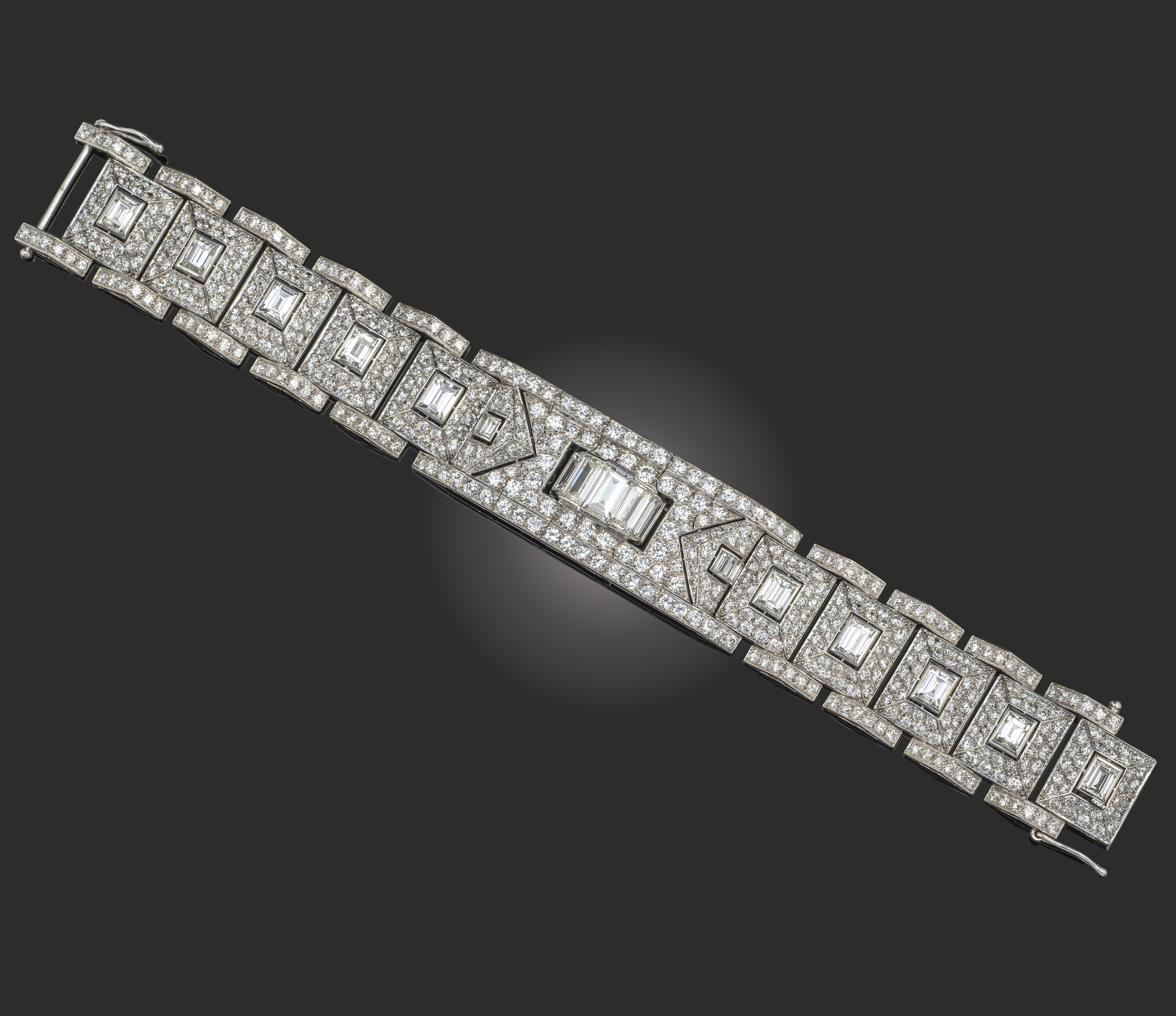 An Art Deco diamond strap bracelet, of geometric design, the central section of linking pavé-set with round brilliant-cut diamonds and centred with a domed arrangement of baguette-shaped diamonds, the strap formed of frustum-shaped links pavé-set with round brilliant-cut diamonds and each centred with a step-cut diamond, mounted in platinum, total diamond weight approximately 25.00cts, length 18cm