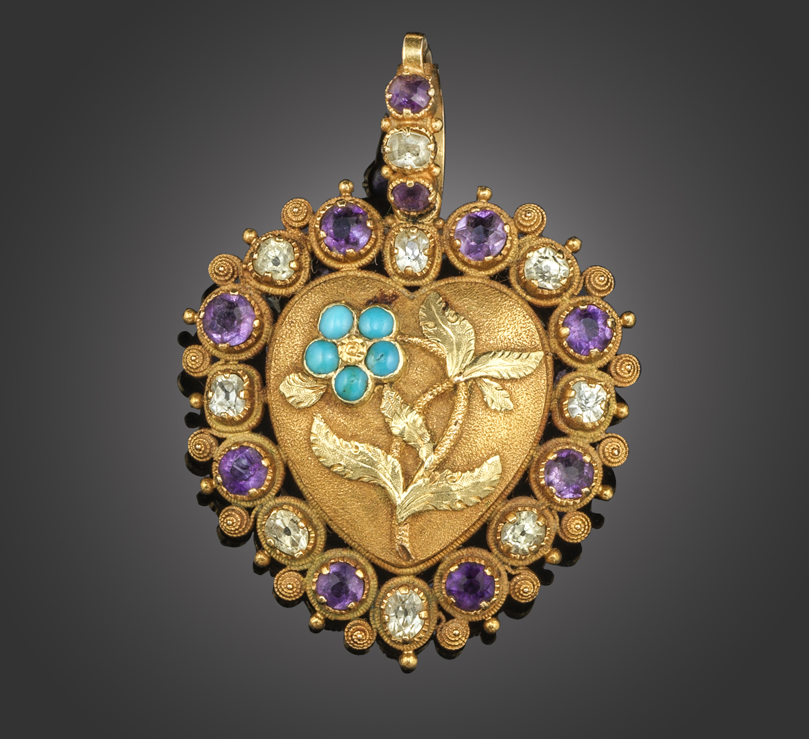 A Regency multigem-set gold pendant, of heart shaped design, the central forget-me-not motif set with turquoise cabochons, within a border of chrysolites and amethysts in gold filigree surrounds below a conforming bail, glazed locket compartment to the reverse, length 3.8cm