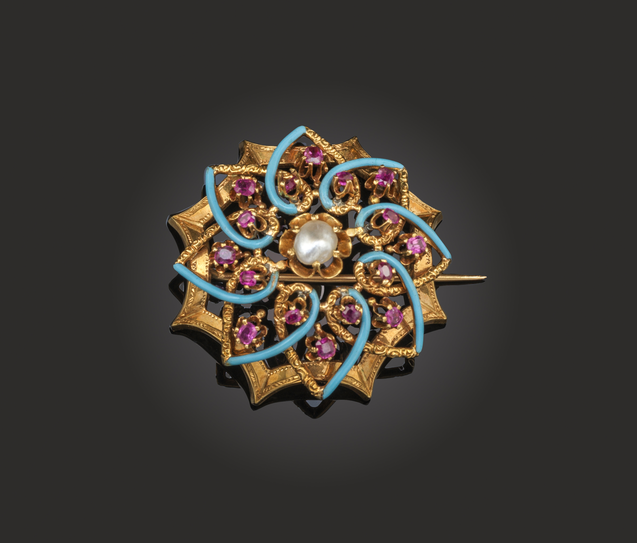 A mid 19th century enamel and gem-set brooch, centred with a pearl within a border of interlocking hearts detailed with blue enamel and set with rubies in yellow gold, French control marks and rubbed maker's lozenge, length 3.8cm, pearl untested, case