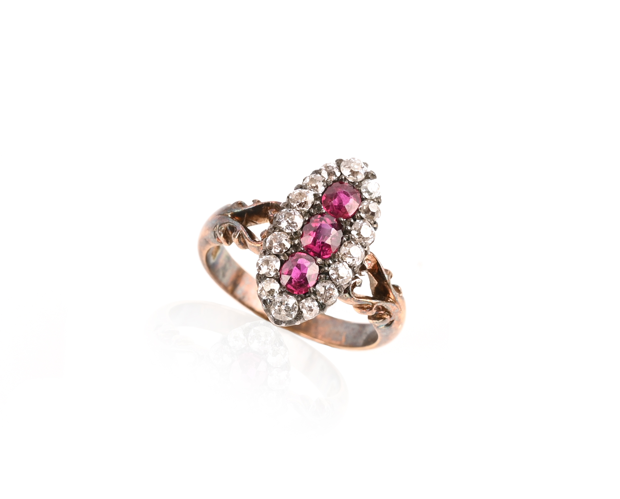 A late 19th century ruby and diamond cluster ring, of eliptical design, set with three rubies in a diamond surround in yellow gold, size N 1/2