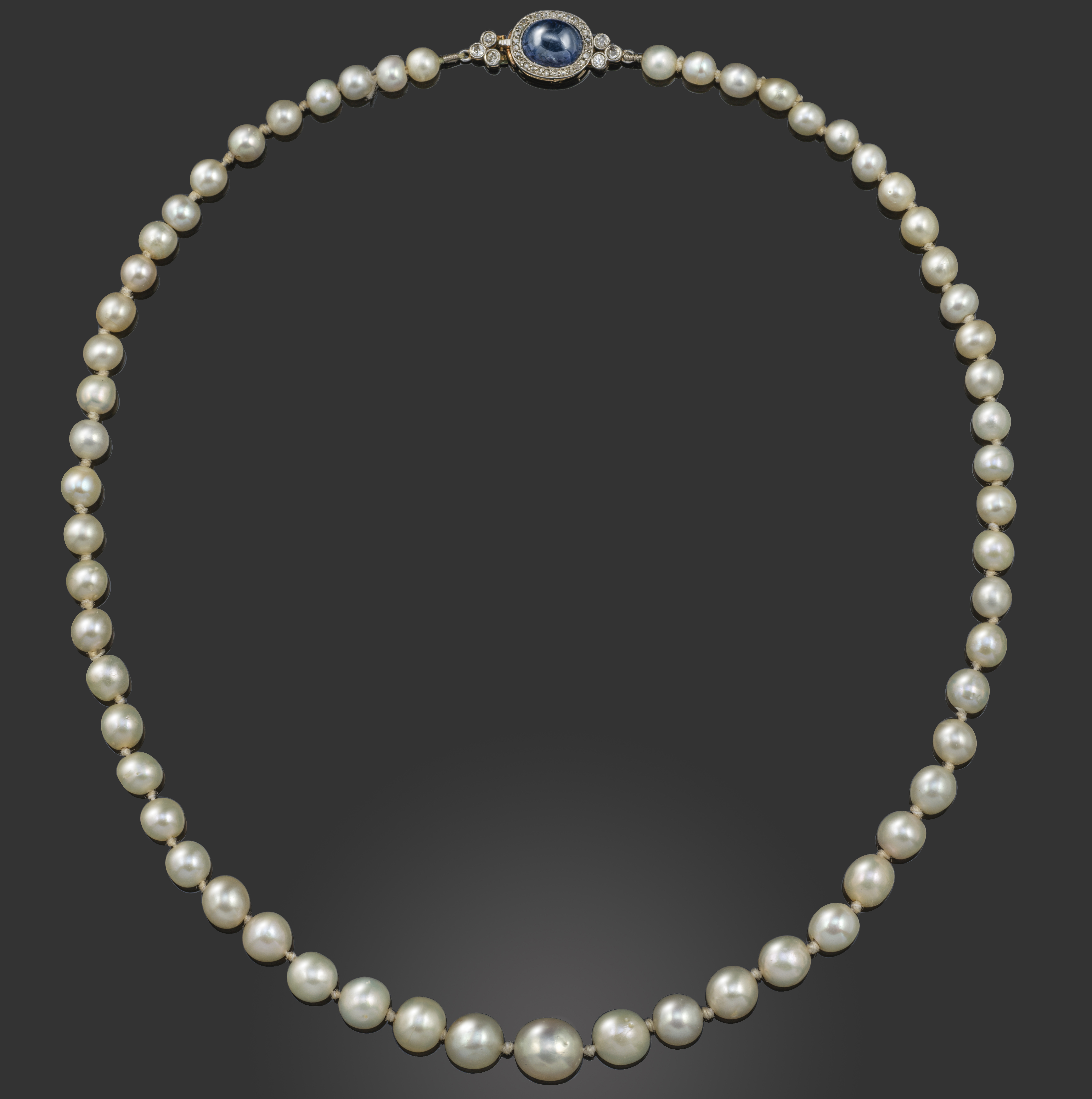 A natural pearl necklace, early 20th century, designed as a single strand of graduated natural pearls measuring approximately 4.75-9.21mm diameter, to a clasp set with a cabochon sapphire bordered by rose-cut diamonds, length 40cm