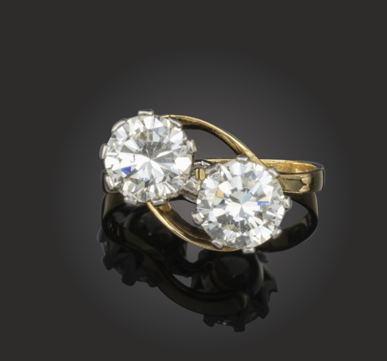 A diamond two-stone ring, set with round brilliant-cut diamonds weighing 2.23 and 2.24cts in platinum and 18ct gold, Birmingham hallmarks, size W