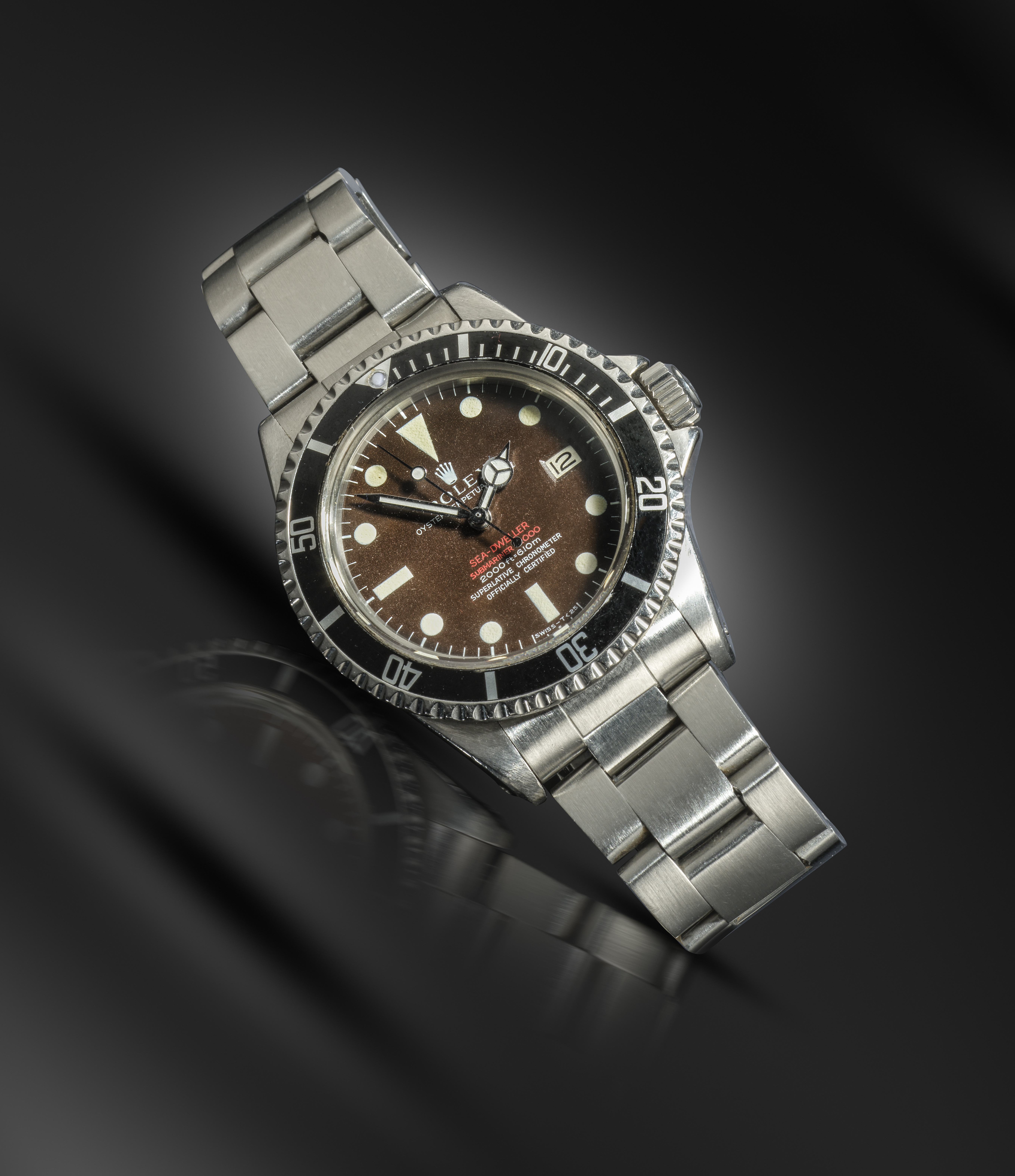 Rolex, a gentleman's stainless steel Double Red Sea-Dweller wristwatch, ref.1665, circa 1972, the tropicalised brown dial with 'Sea-Dweller Submariner 2000' in red and date wheel at 3 o'clock, to a calibrated bezel with black insert and stainless steel bracelet, case width 4cm, dial and clasp signed Rolex, automatic movement, reference number 1665, serial number 2930375, case stamped Rolex, with Rolex warranty dated 26th July 1975 and Rolex servicing document dated 8th September 1980