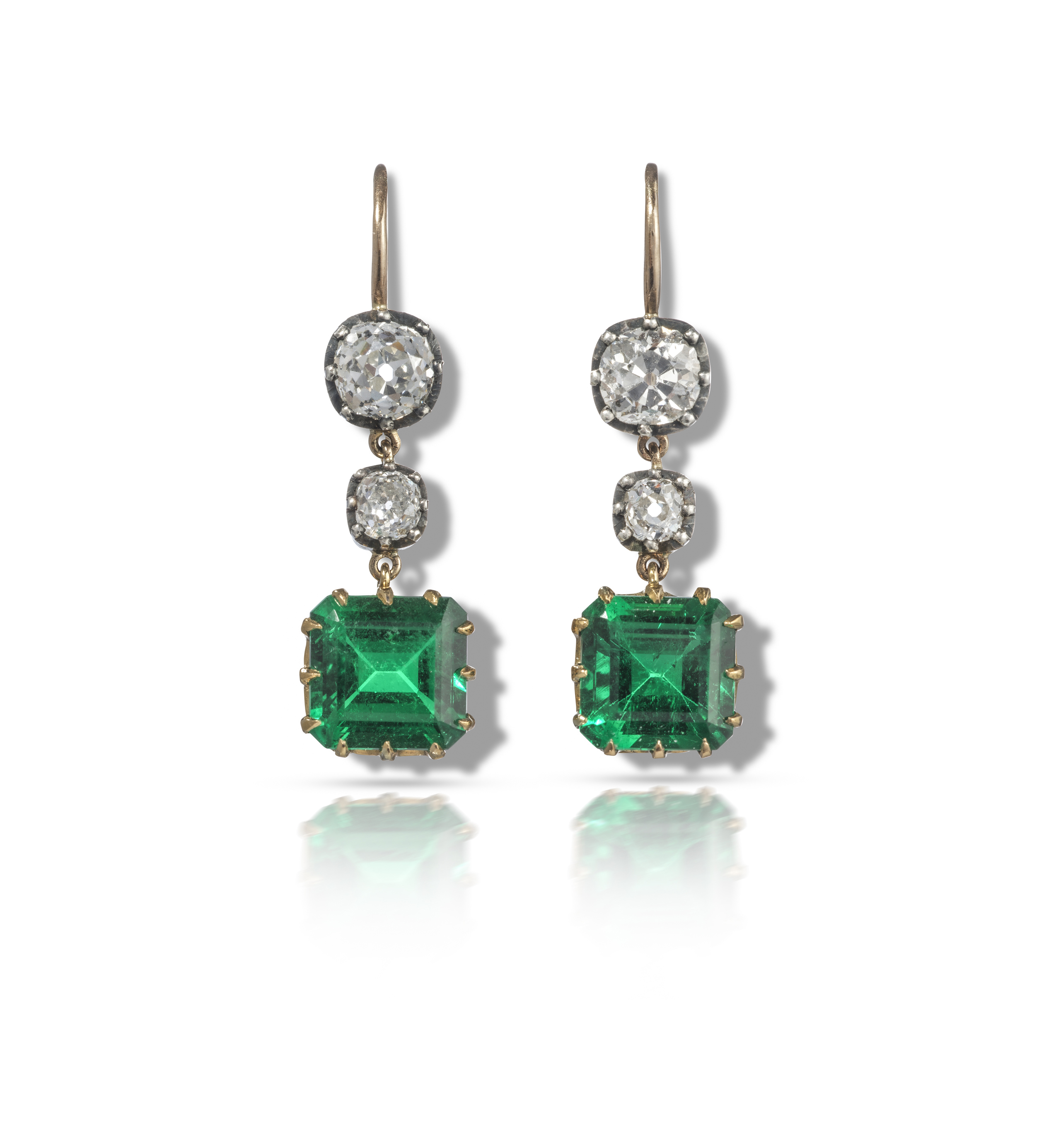 A pair of fine emerald and diamond drop earrings, the graduated cushion-shaped diamonds each suspend square step-cut emeralds weighing 2.91cts and 2.90cts claw-set in yellow gold, post fittings length, 3.2cm