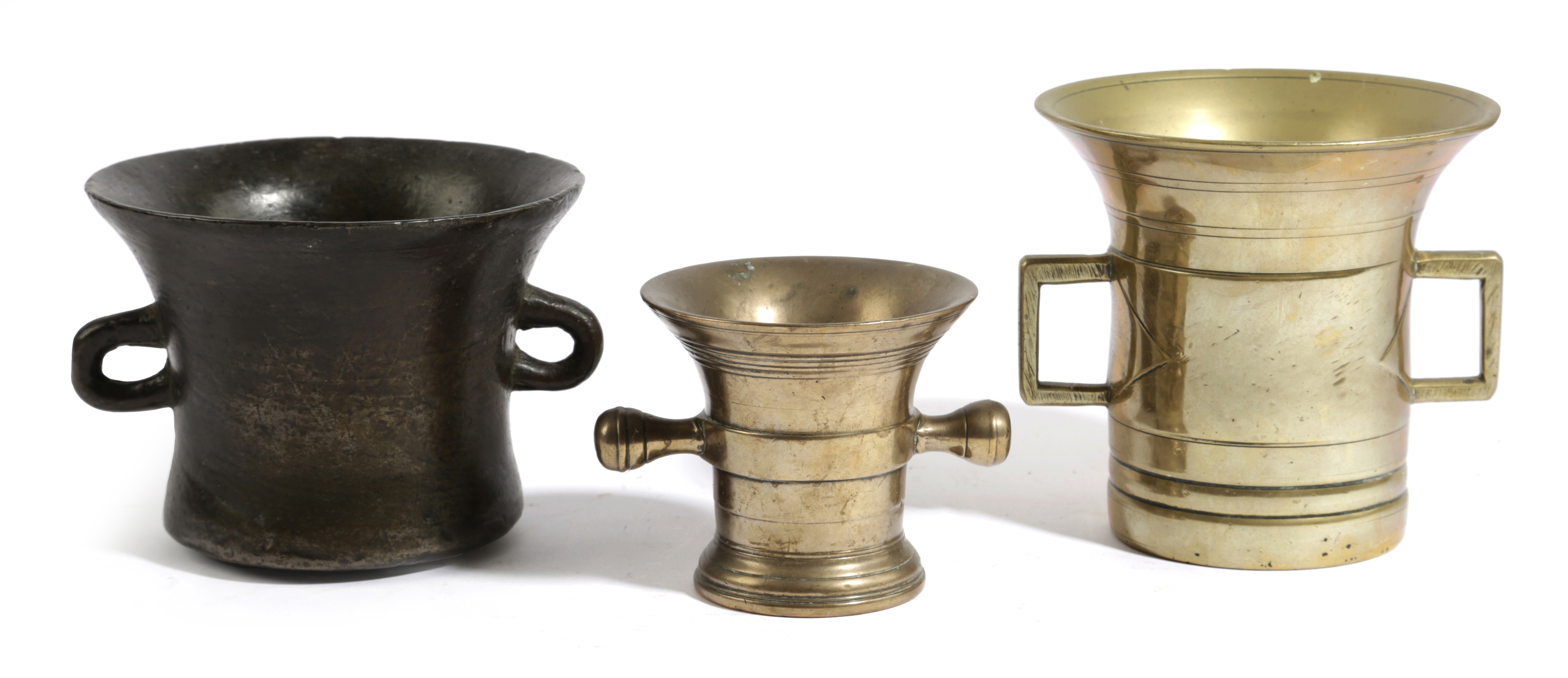 with a pair of lug handles, with a scratched 'W' mark, a German bronze mortar, 18th century, probably Nuremberg, with lozenge and banded decoration, and a small Dutch bronze mortar, 18th century (3)