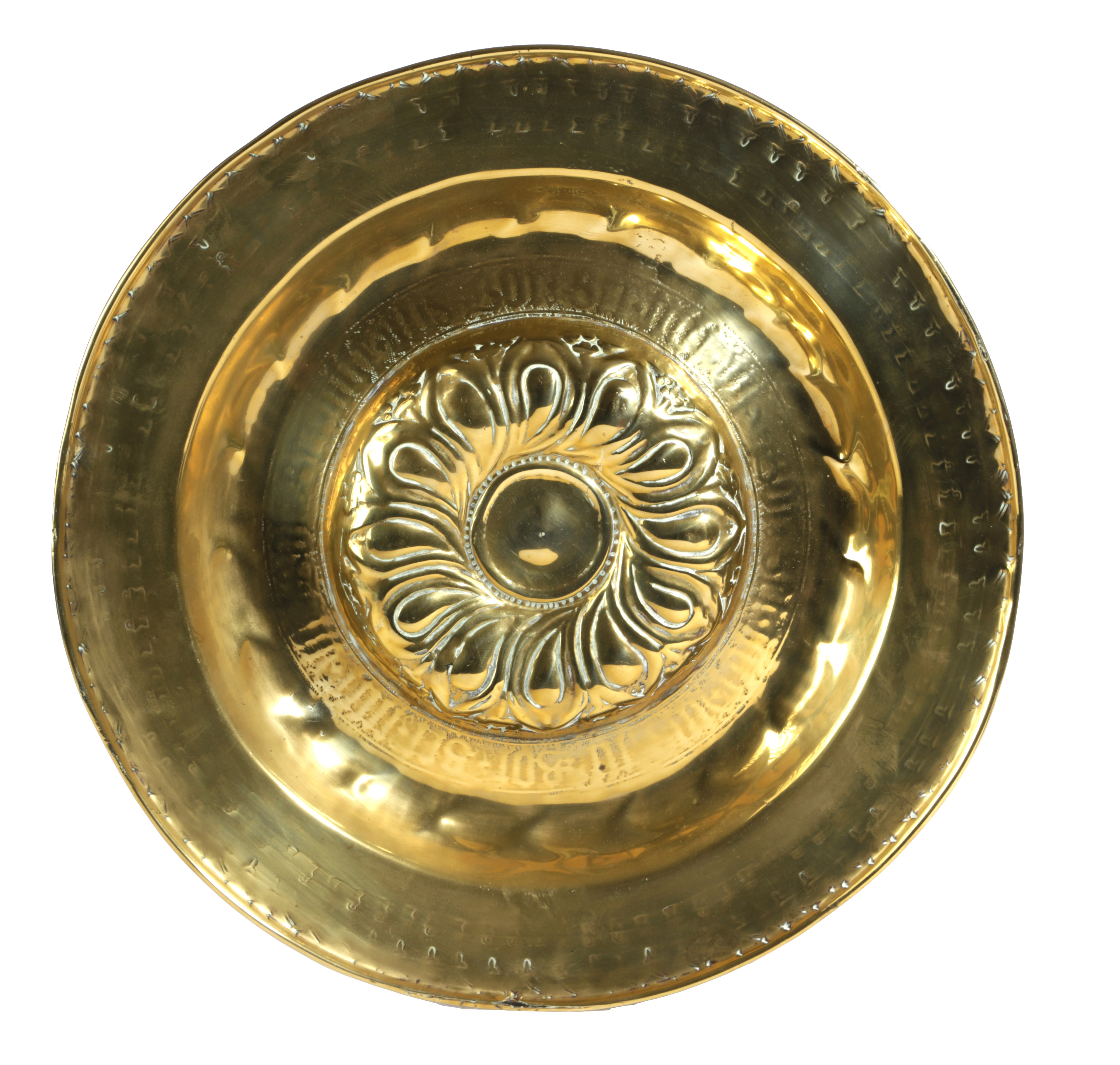 the centre with a repoussé whorl boss inside a Gothic script border, the rim with three bands of punched decoration