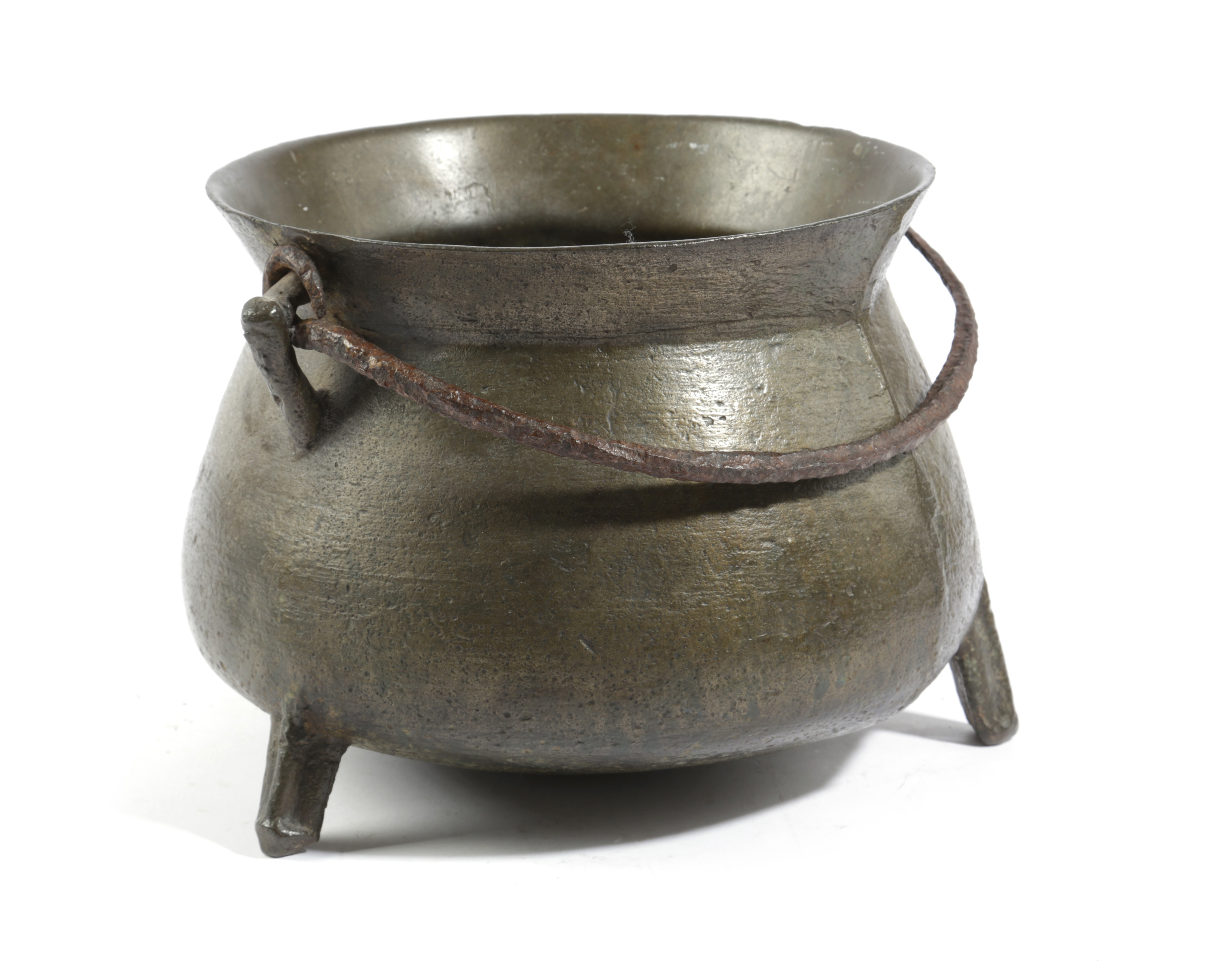 with a flared rim, an iron swing handle and angular lugs, on moulded tripod feet