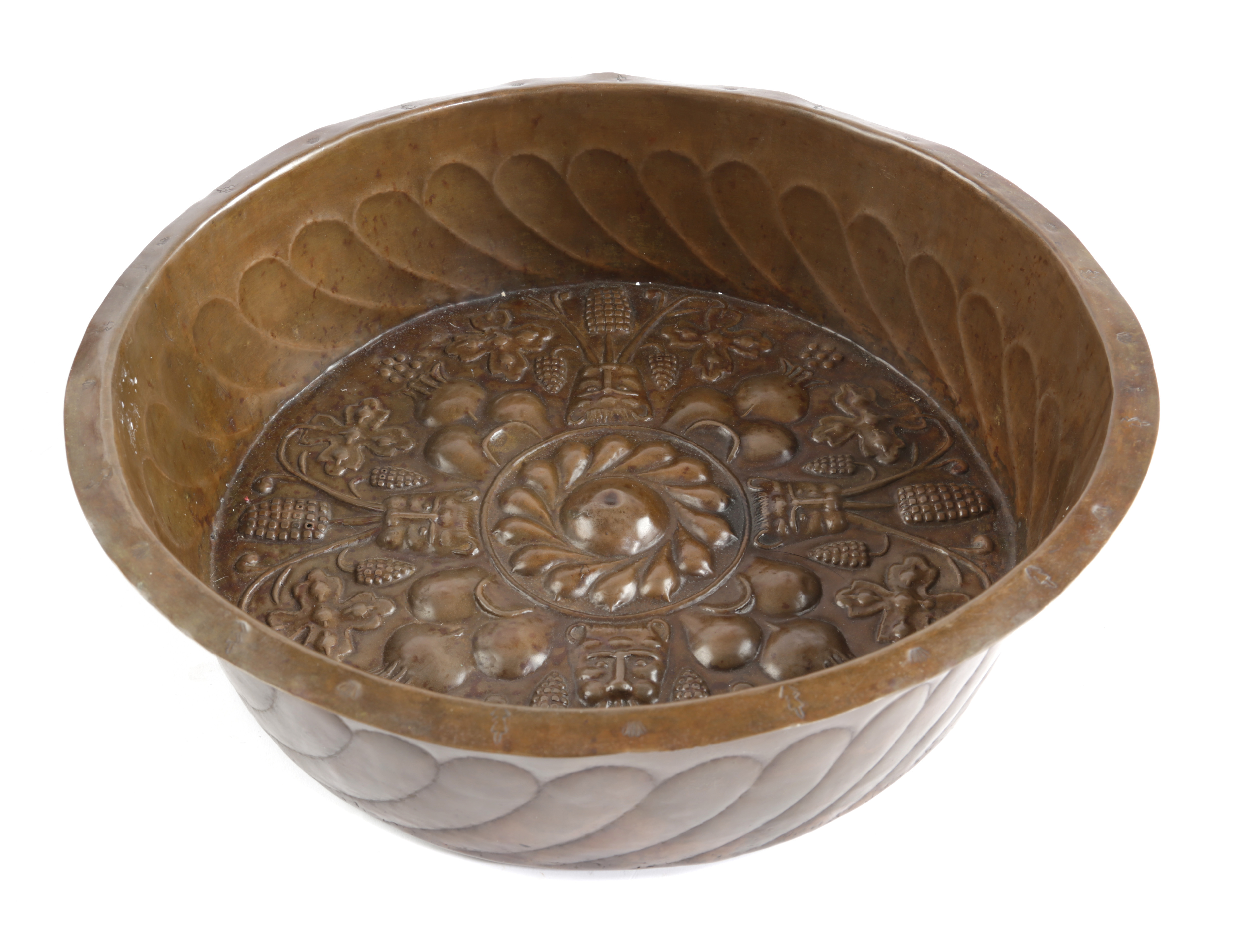 repoussé decorated with a central gadrooned rondel surrounded by lion masks with fruiting vines interspersed by pomegranates, with gadrooned sides and a narrow rim with punched decoration