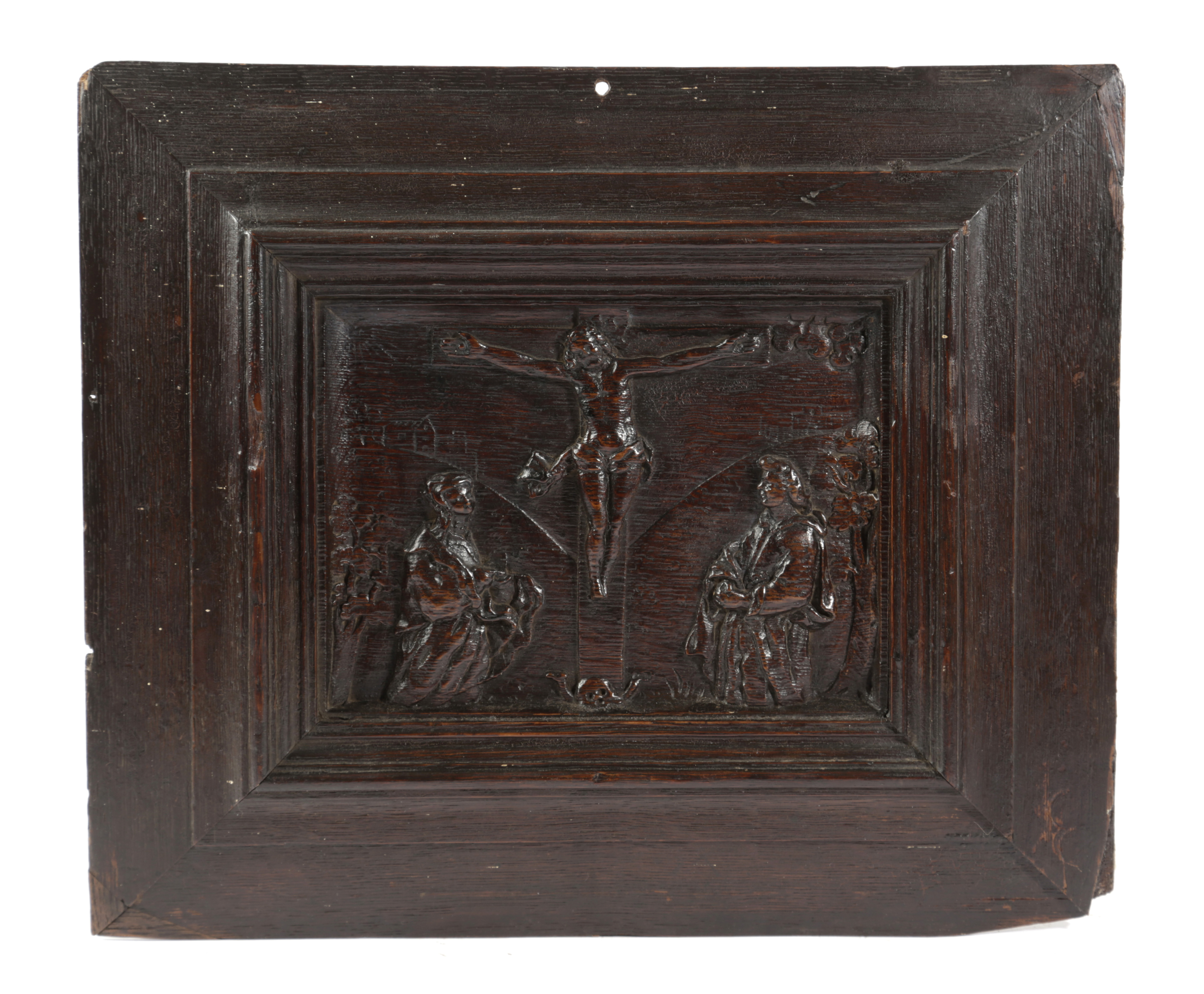 depicting Christ on the Cross with the Virgin Mary to one side and John the Evangelist to the other, in its original moulded oak frame
