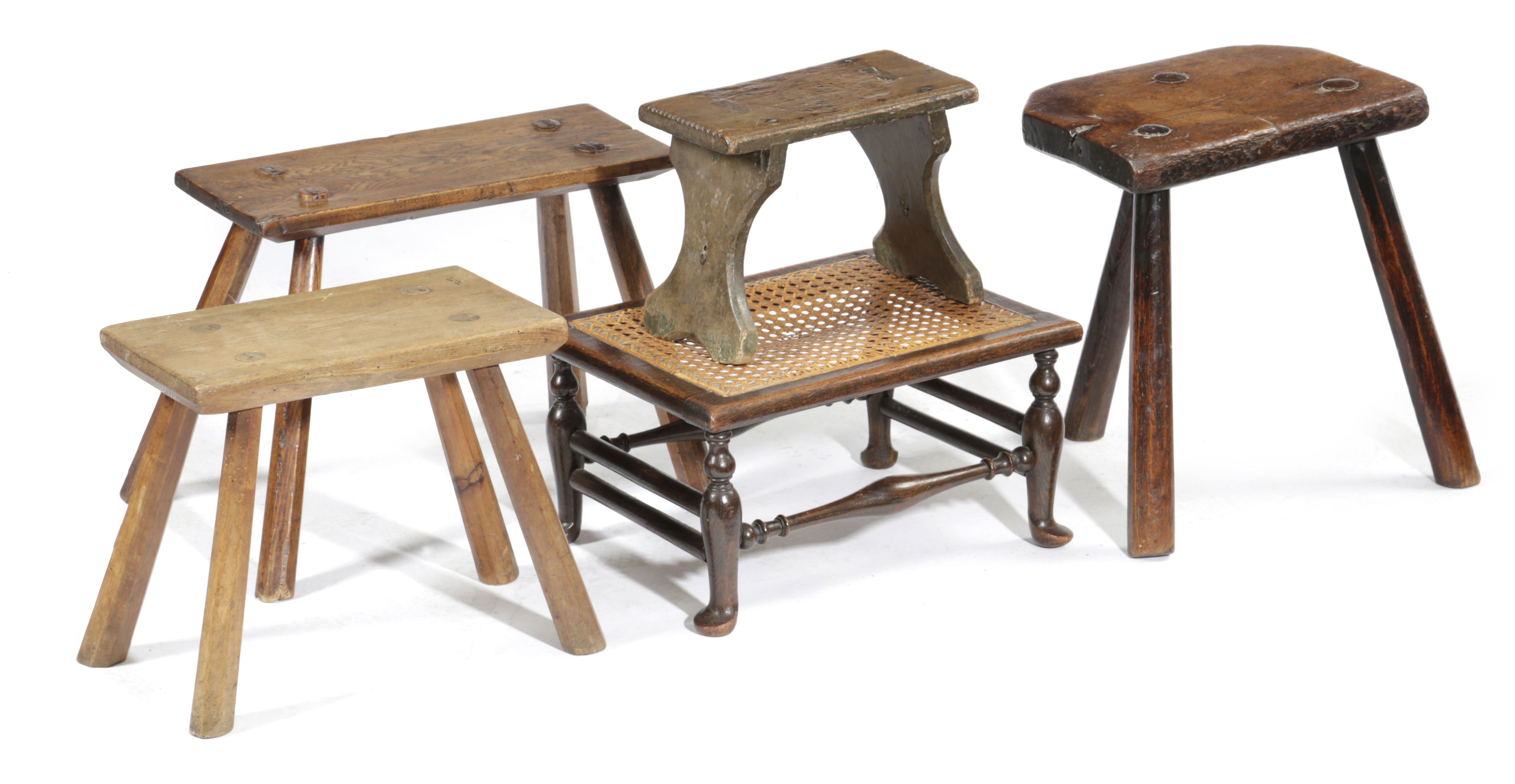 including an ash dairy stool, an oak stool with a caned seat on cabriole legs and other examples (5)