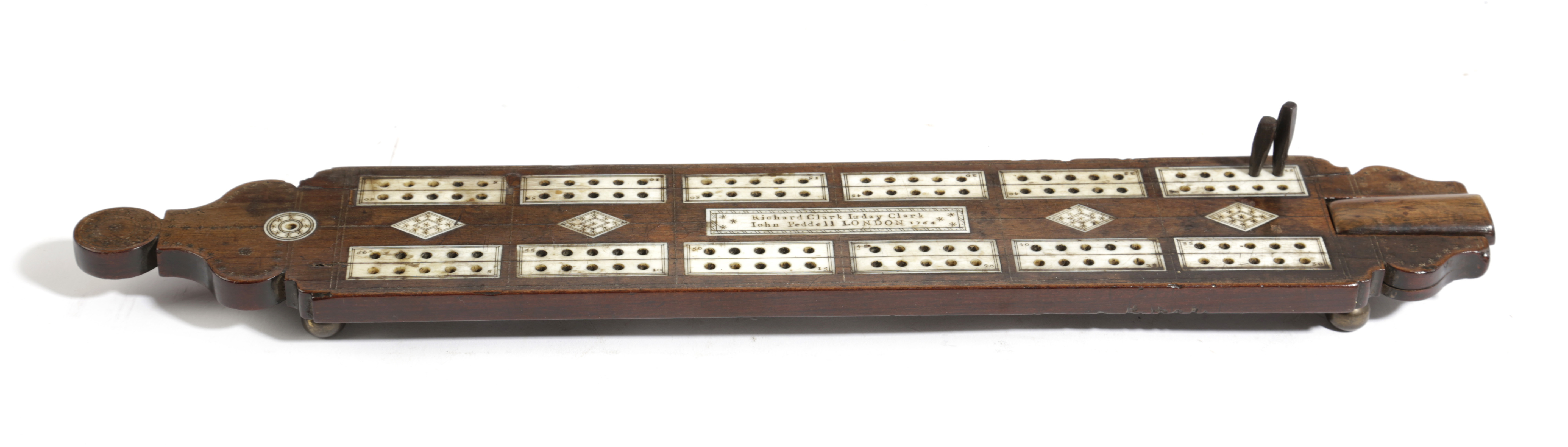of rectangular form with shaped ends and painted star decoration, inlaid with numbered bone panels flanking decorative lozenges and a central panel inscribed 'Richard Clark Iuday Clark Iohn Peddell LONDON 1764', with a covered marker box and gilt brass feet