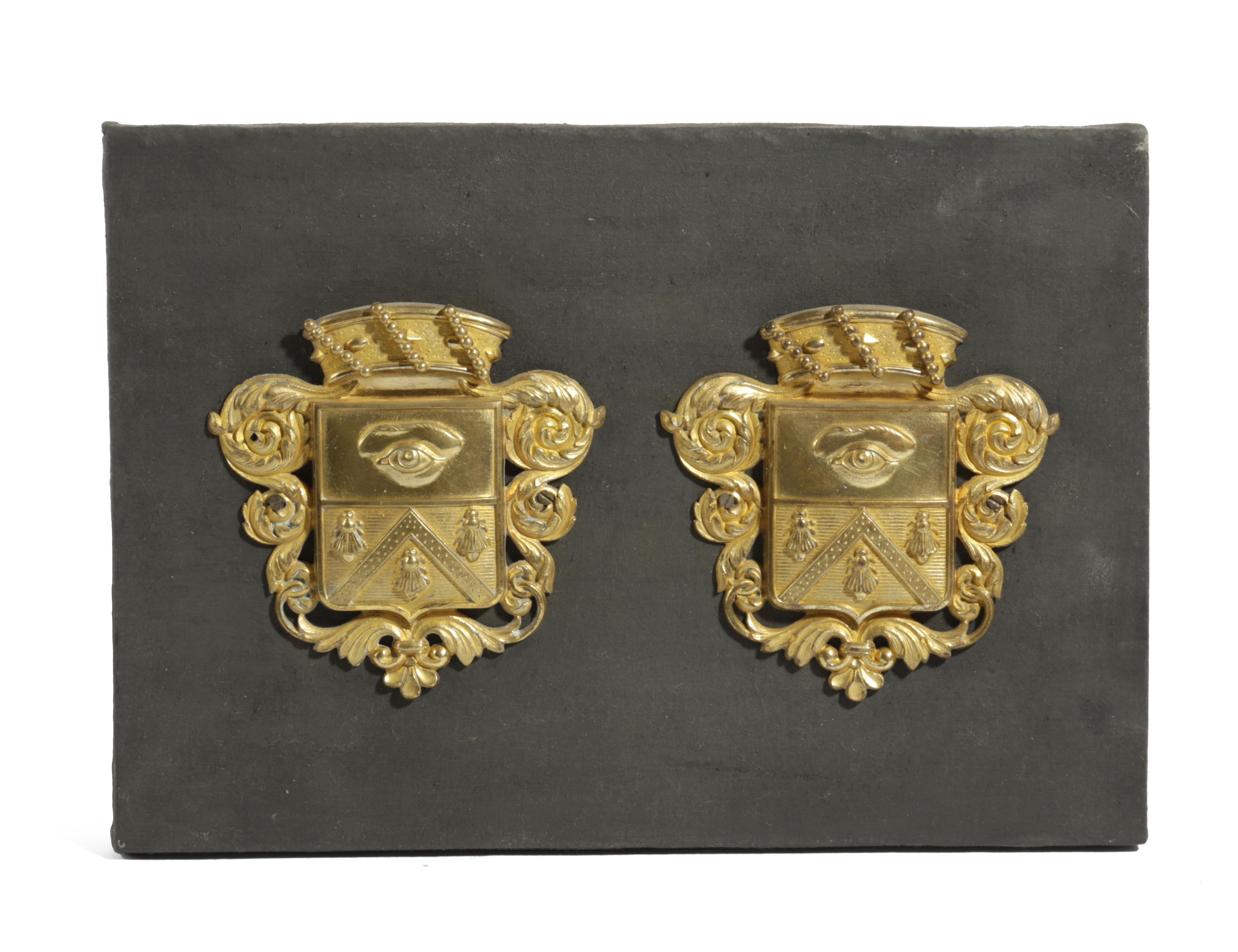 A PAIR OF FRENCH GILT BRASS ARMORIAL PLAQUES