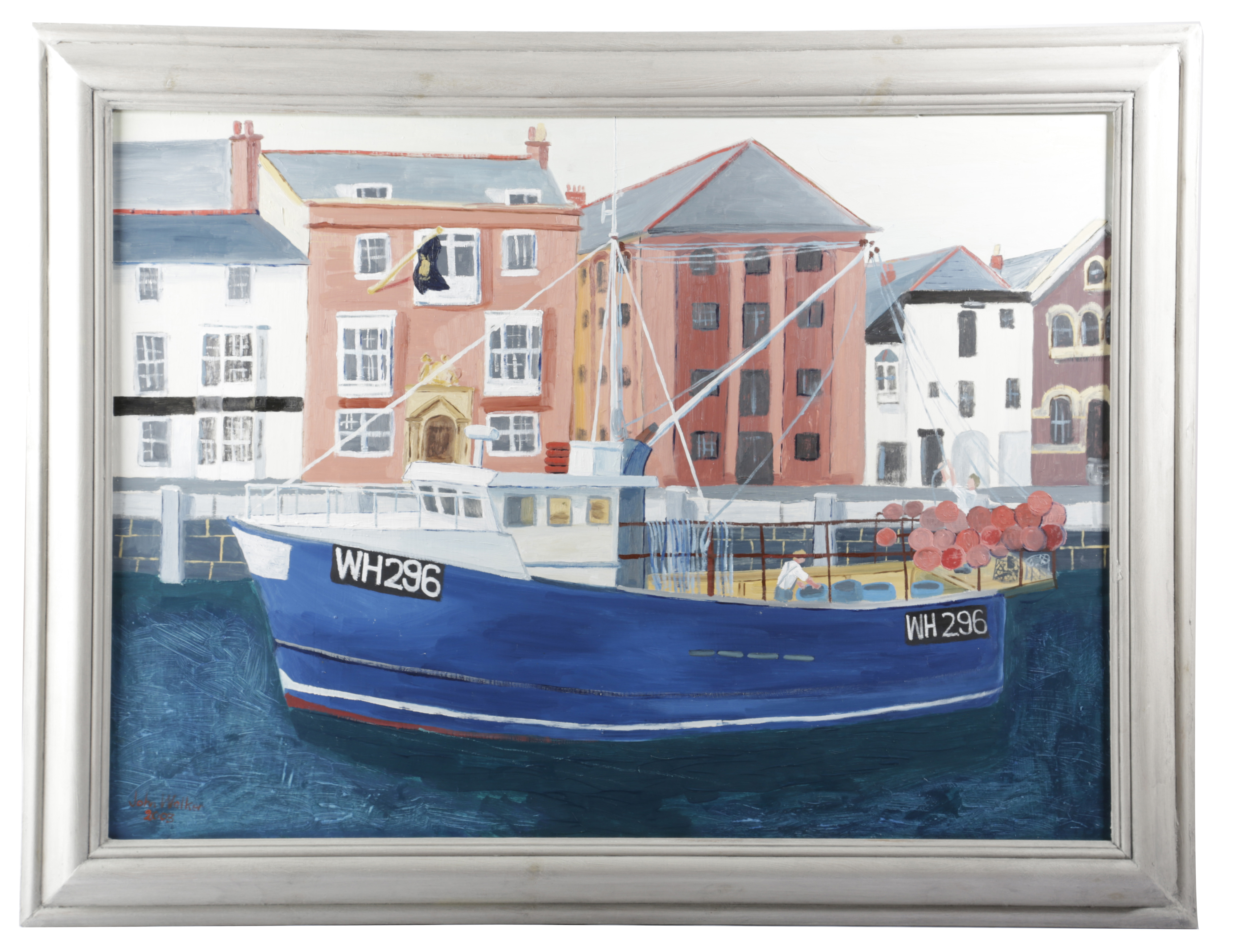 Φ A MODERN PAINTING OF A FISHING BOAT IN A HARBOUR