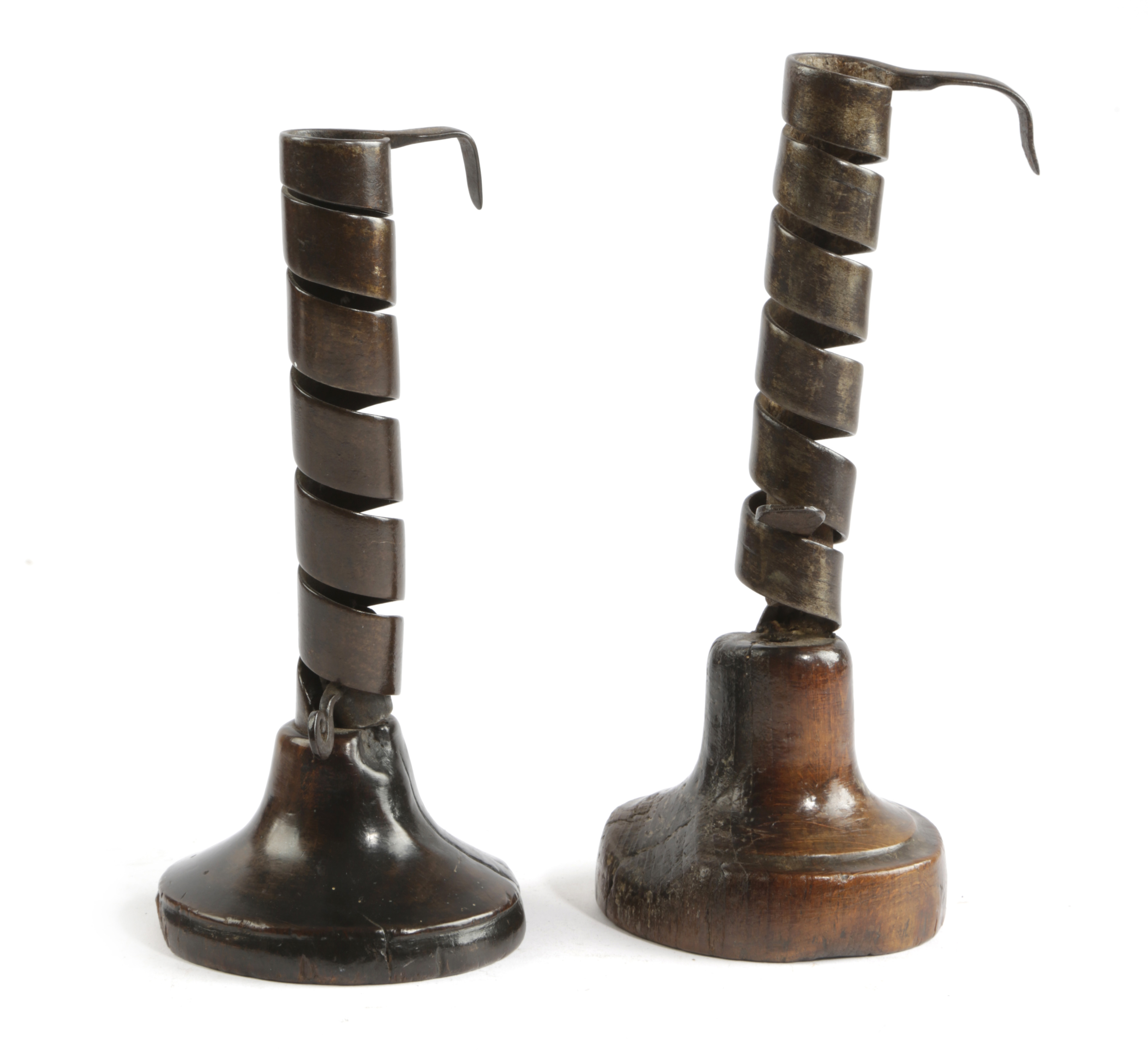 TWO TREEN AND WROUGHT IRON SPIRAL CANDLESTICKS