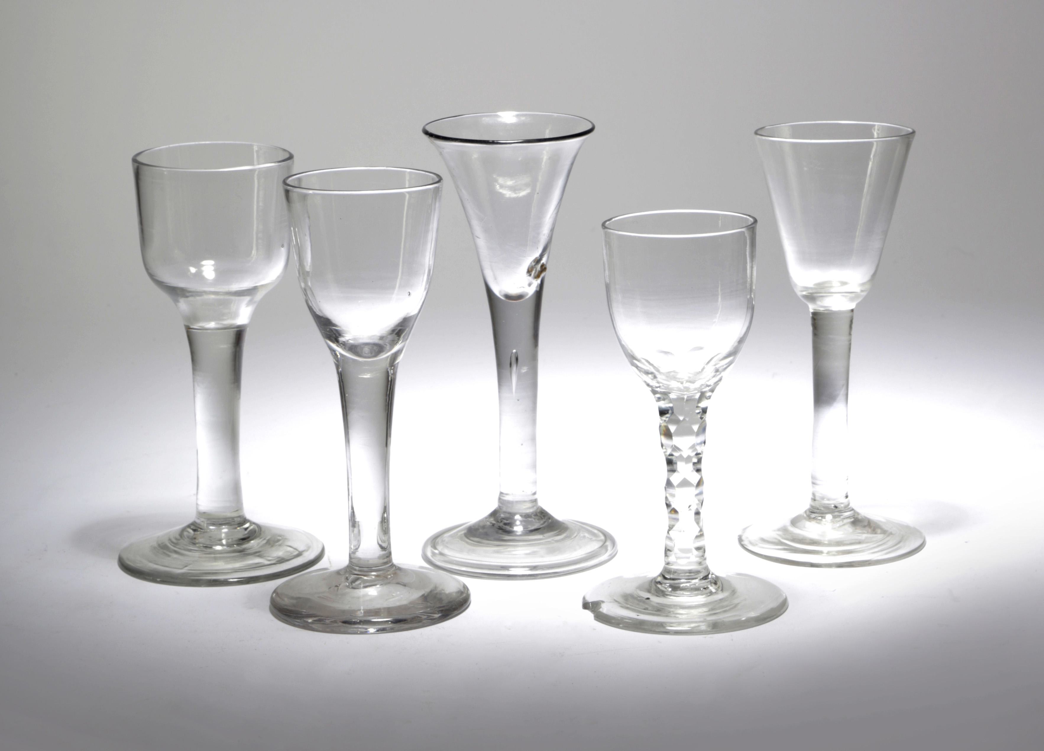 comprising: one with a trumpet bowl and teardrop stem, one with an ogee bowl and plain stem, one with a rounded ogee bowl and plain stem, one with a tapering bowl and plain stem and the other with an ogee bowl with a faceted stem (5)