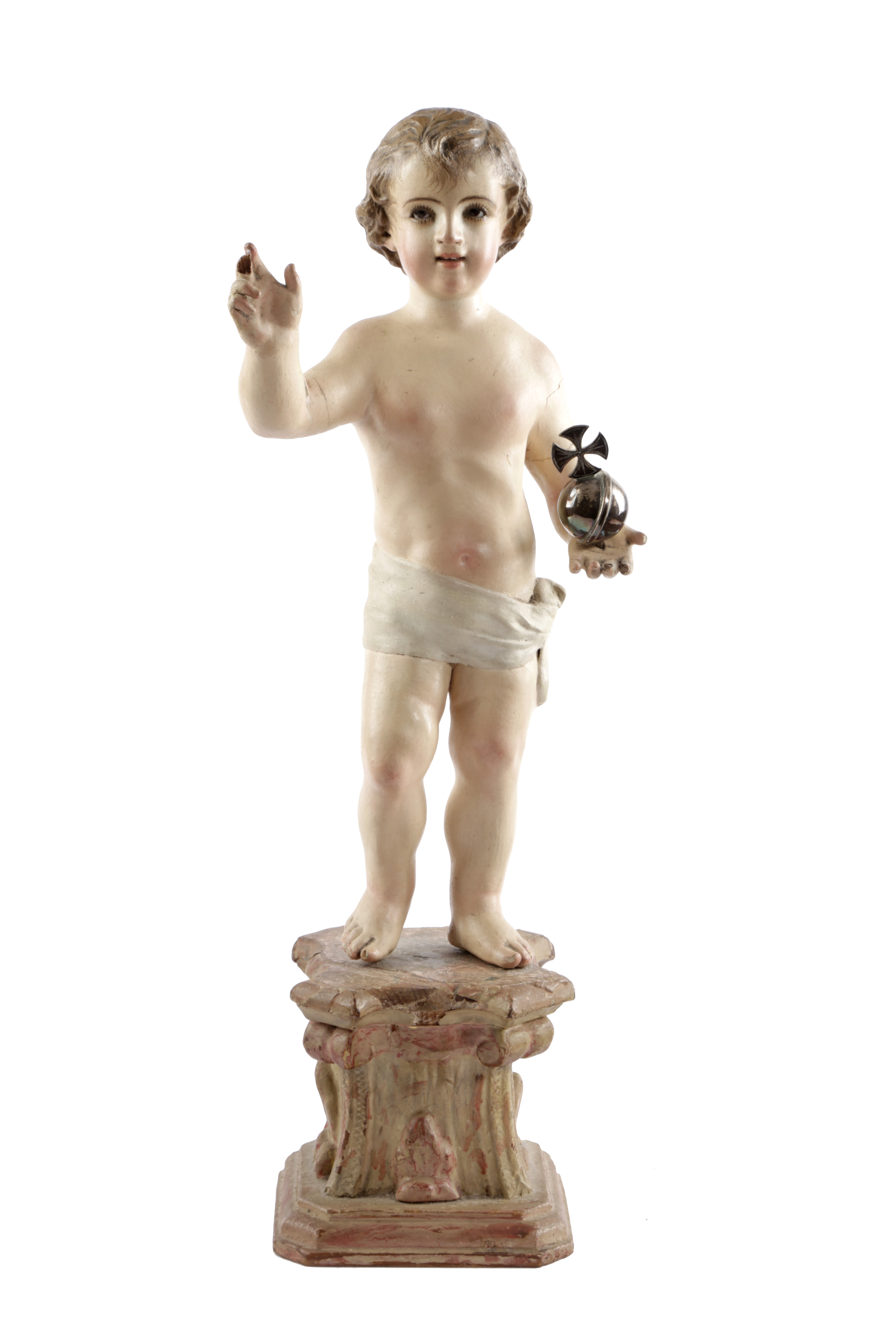 with glass eyes, modelled standing with his right hand raised in blessing and holding a white metal orb in his left, on a scrolling, painted and gilt plinth