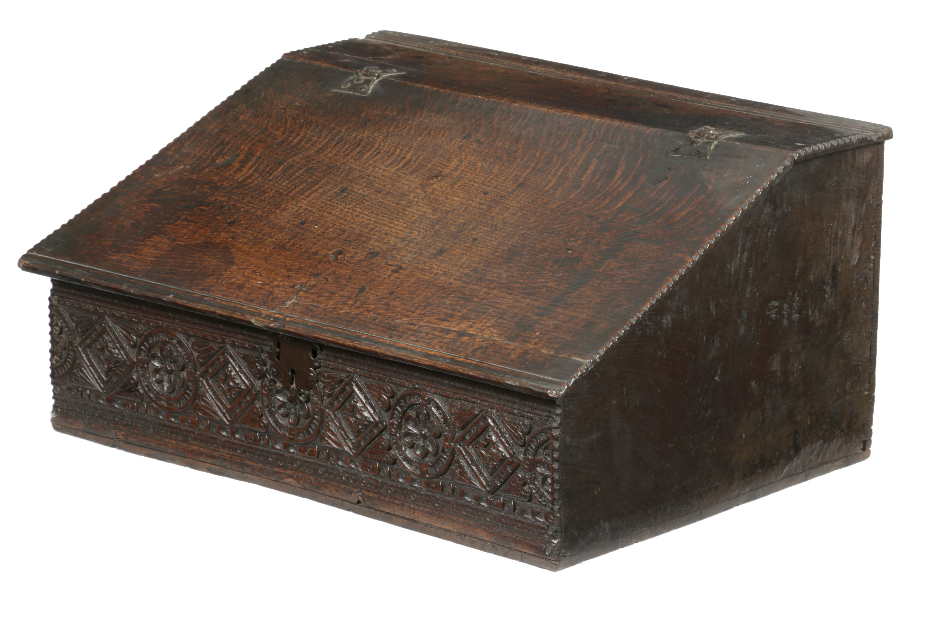 the top with channel moulded and chip carved ends, above a conforming slope, fitted with a channel moulded rear shelf, the front frieze well carved with an alternating run of flowerhead filled rondels and lozenges