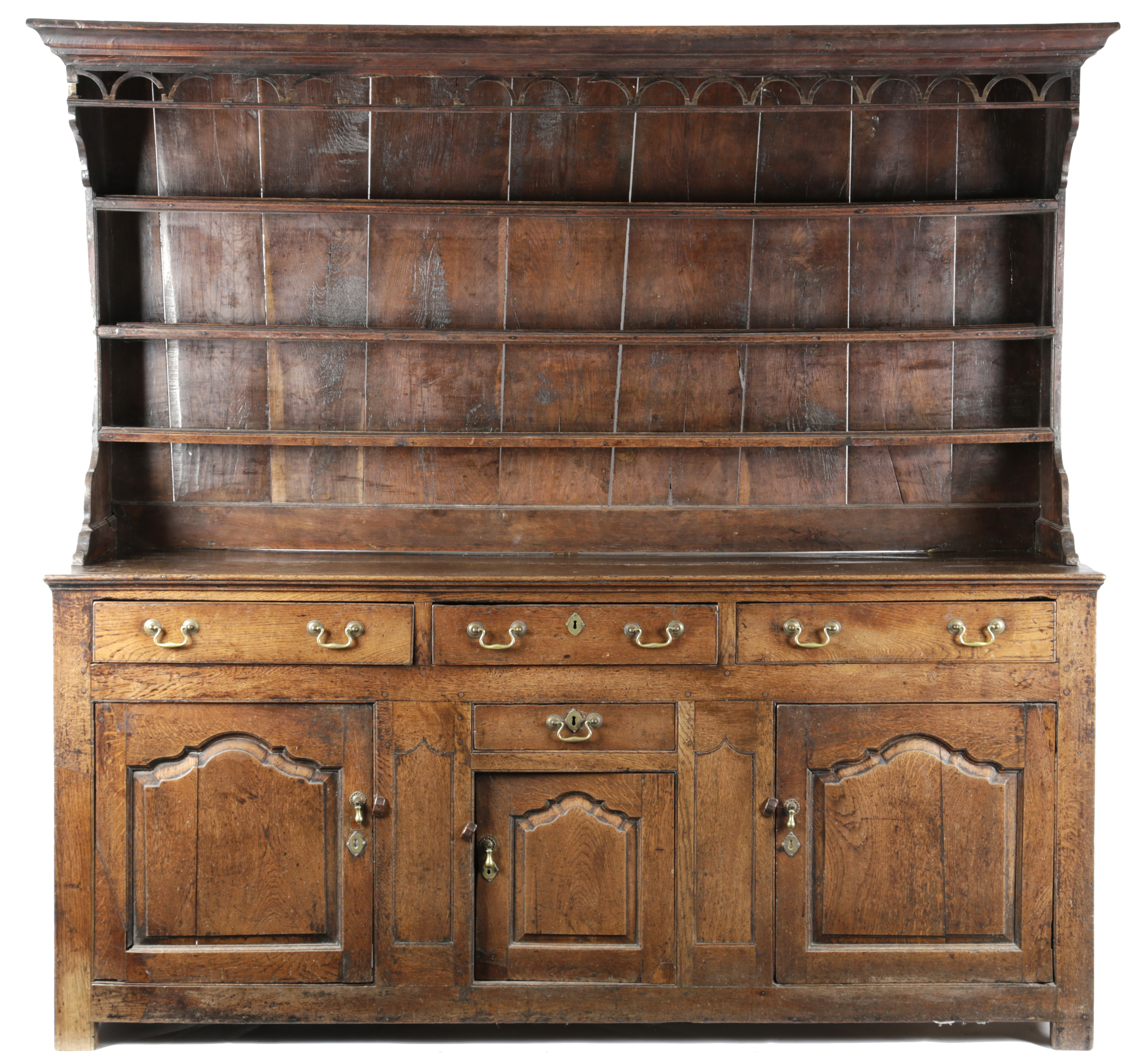 the boarded rack with a lunette fretwork frieze, fitted with three shelves, the lower section with three drawers over a pair of ogee arched fielded cupboard doors, flanked by unusual pointed arched flush panels, centred by a small drawer over a conforming cupboard door