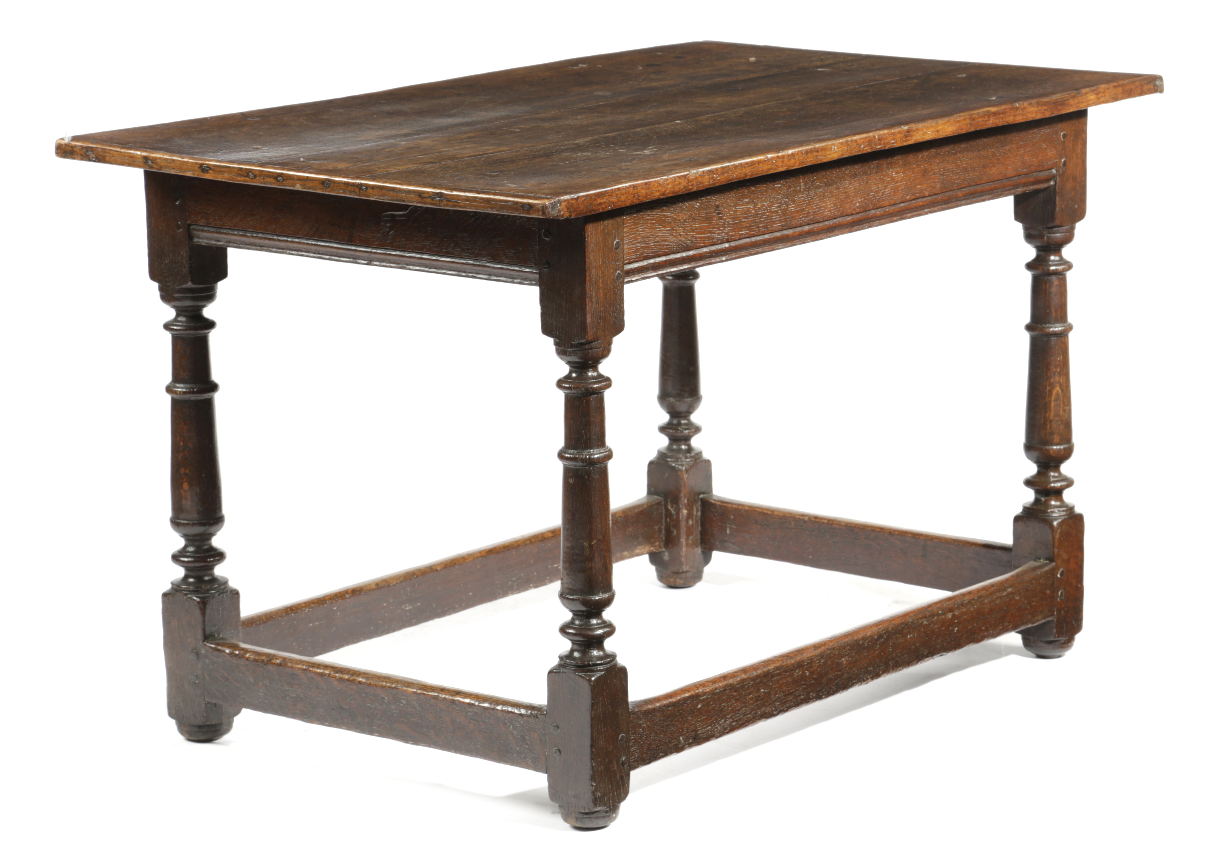 the boarded top with cleated ends on ring turned gun barrel legs united by peripheral stretchers