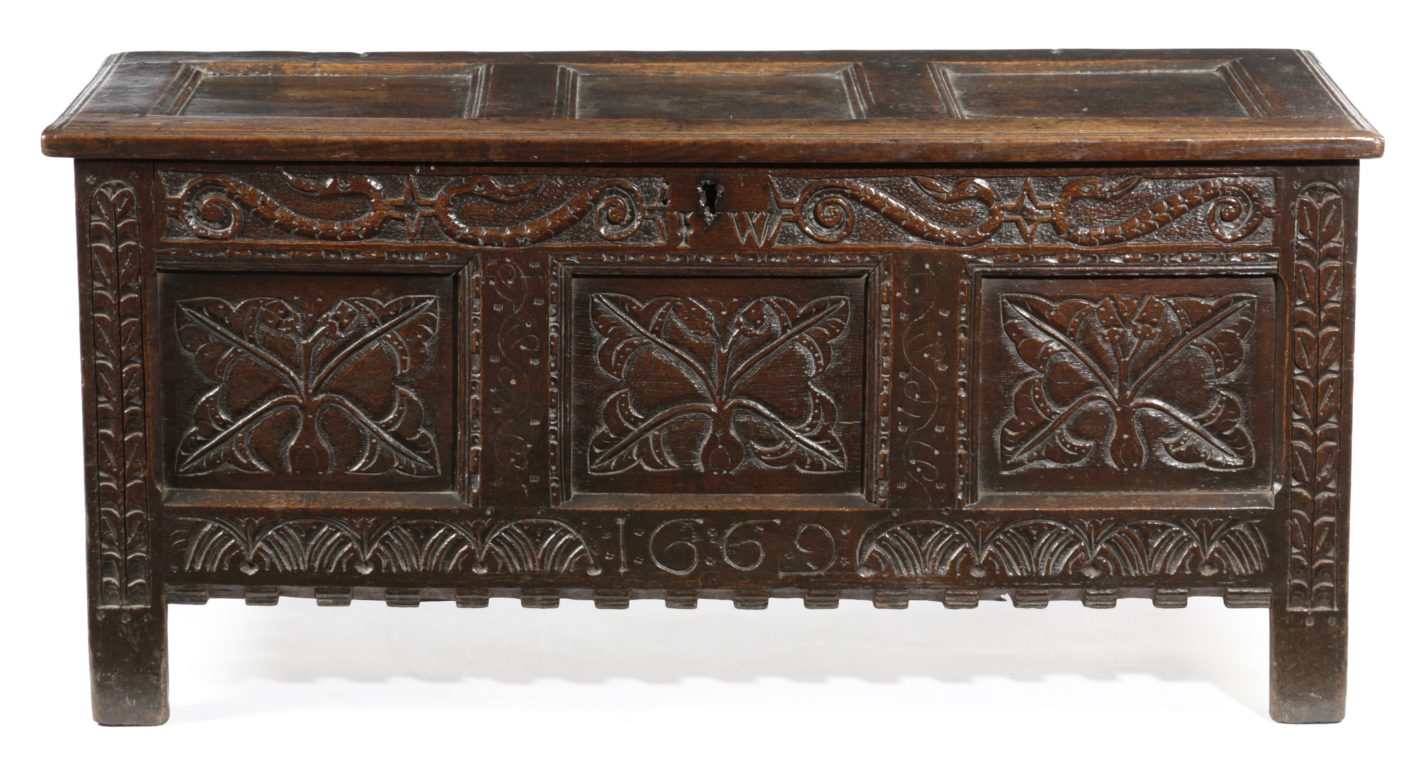 the triple panelled top revealing and an open till, the frieze carved with dragons and the initials 'IW' above three panels of leaves and flowers