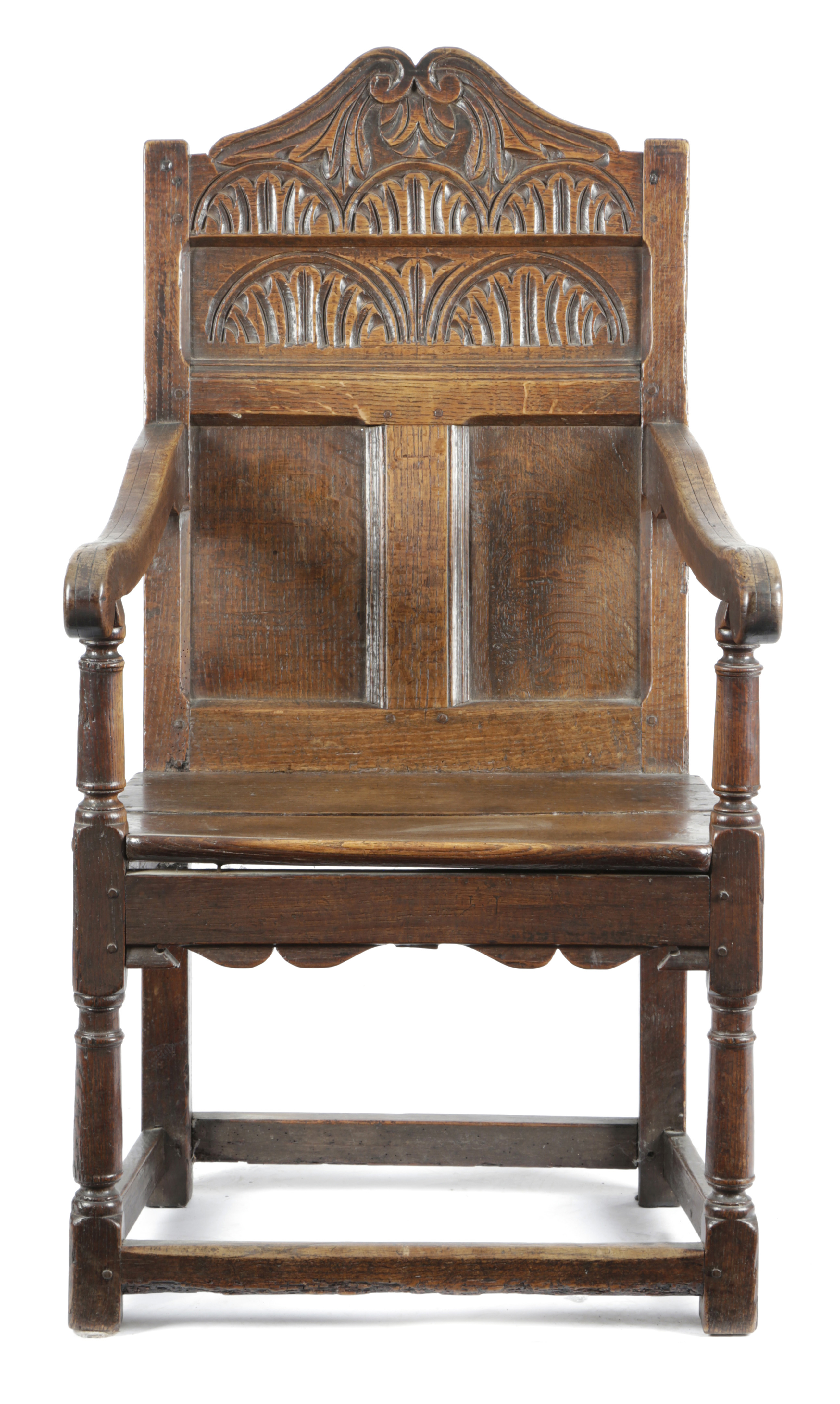 A CHARLES II OAK PANELLED BACK ARMCHAIR
