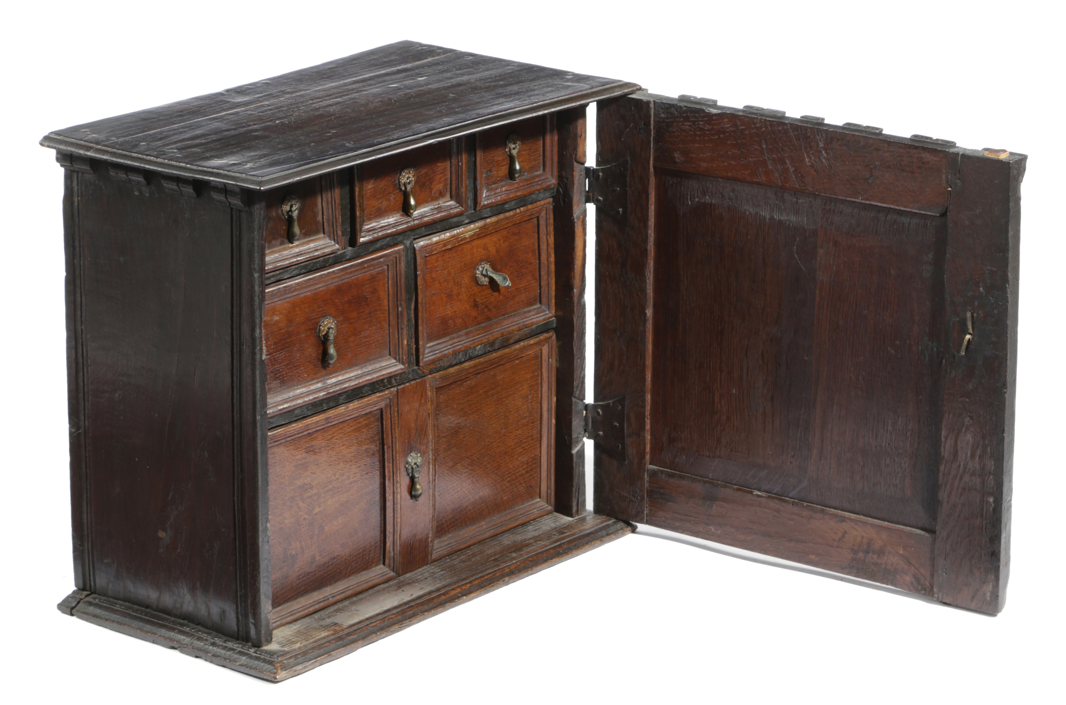 the dentil moulding above a carved panel with tulips and other flowers revealing an interior fitted with six drawers
