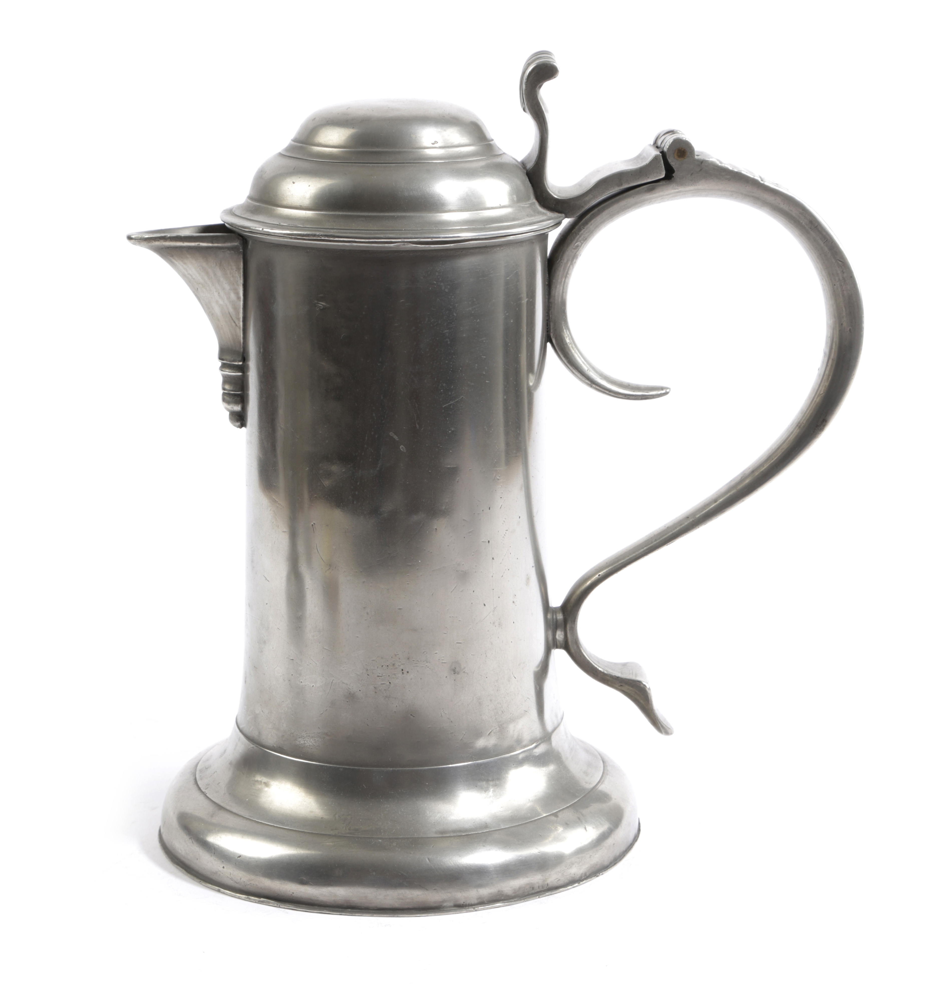 four hallmarks of John Heaney, Dublin, (c.1767-1807), (PS4536) and crowned 'X' inside the base, a wide spreading foot, double dome-lid, sweeping handle with incurving ‘swan’s neck’ to upper attachment, and a spout with attractive detailing at its lower end, good ‘witness’ marks to back of bold scroll thumbpiece and upper handle which is also engraved ‘DKC, chatter marks under the base