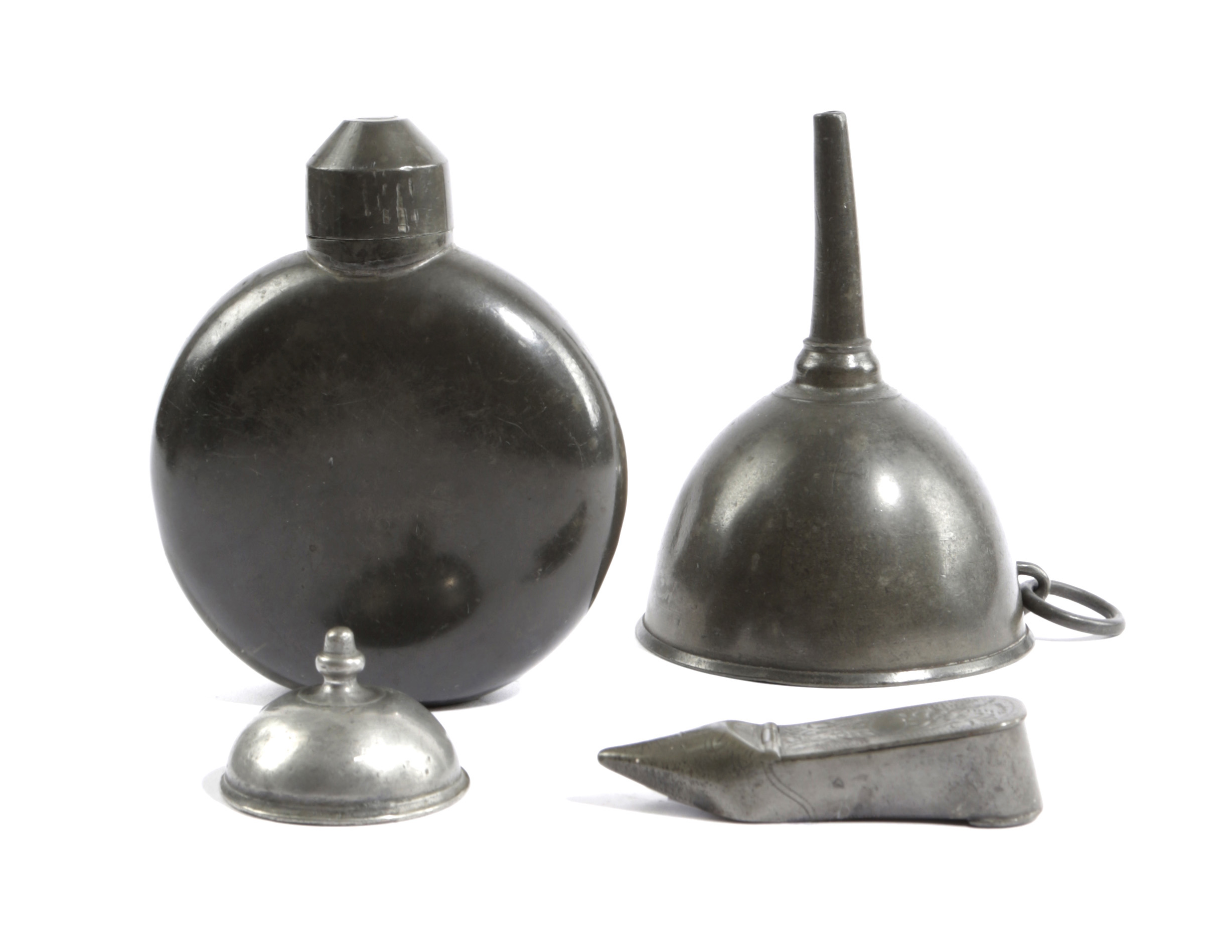 unmarked, with working screw-off cap, the circular body with flattened base, allowing it to stand upright while being filled, both faces slightly convex, together with a funnel with hanging ring, a shoe snuffbox by Richard Webster, Birmingham (fl.c.1845-65) and a slip-on pewter lid for an 18th century English spice pot (4)