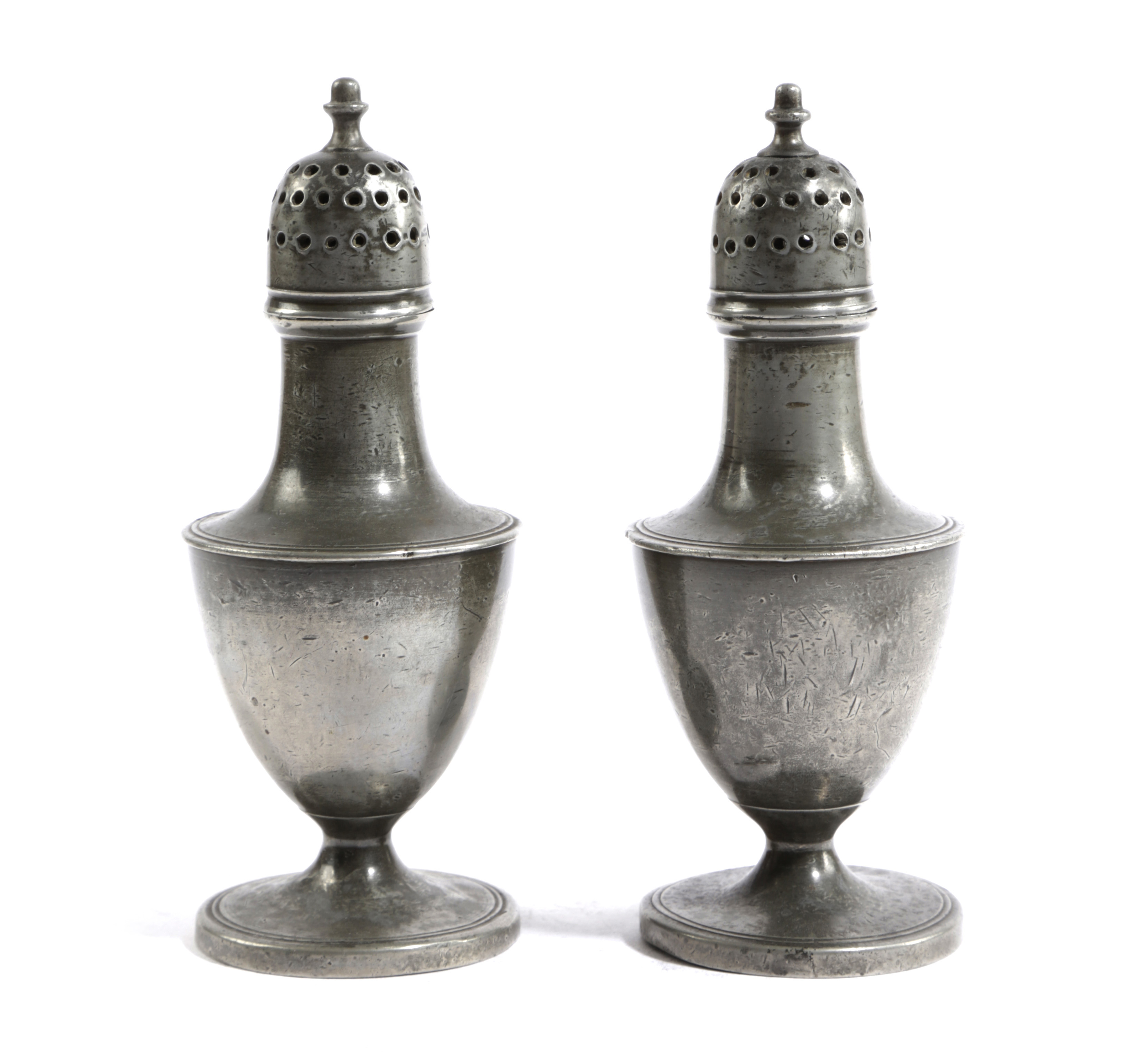 each of urn form, with uncommon, working, rounded lids, unmarked, each plain heavily cast body with a sweeping neck, the screw-on lids with acorn knops and three concentric rings of holes, good detailing of a pair of incised lines to outer edge of lower body and turning lines under the base (2)