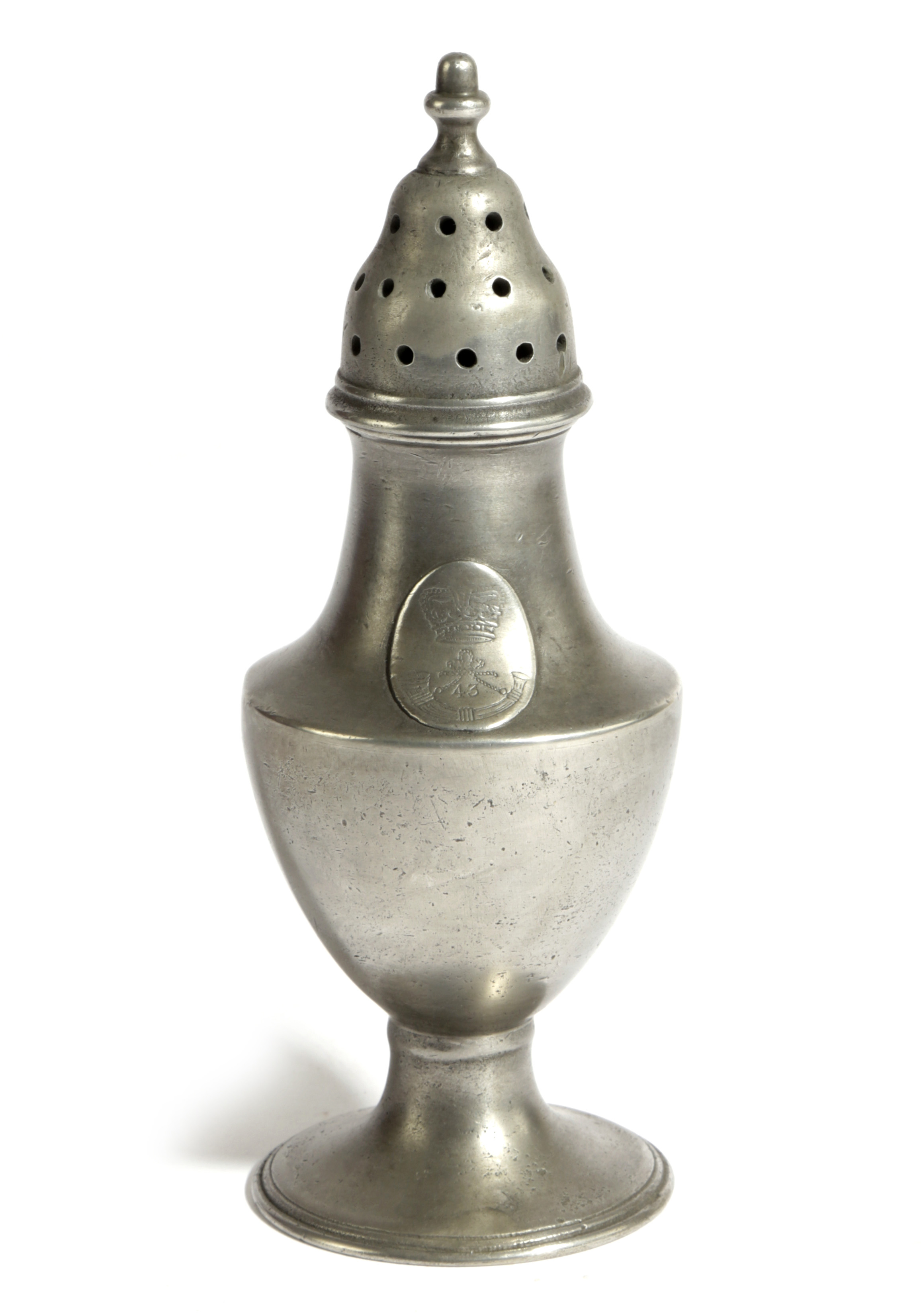 Regimental pewter castors are rare. For a similar example wee the V&A Museum, London, acc. No. M.889-1926 and P/ Hornsby, ‘Pewter of the Western World’ (1983), fig. 436, formerly in the Ken Gordon Collection.