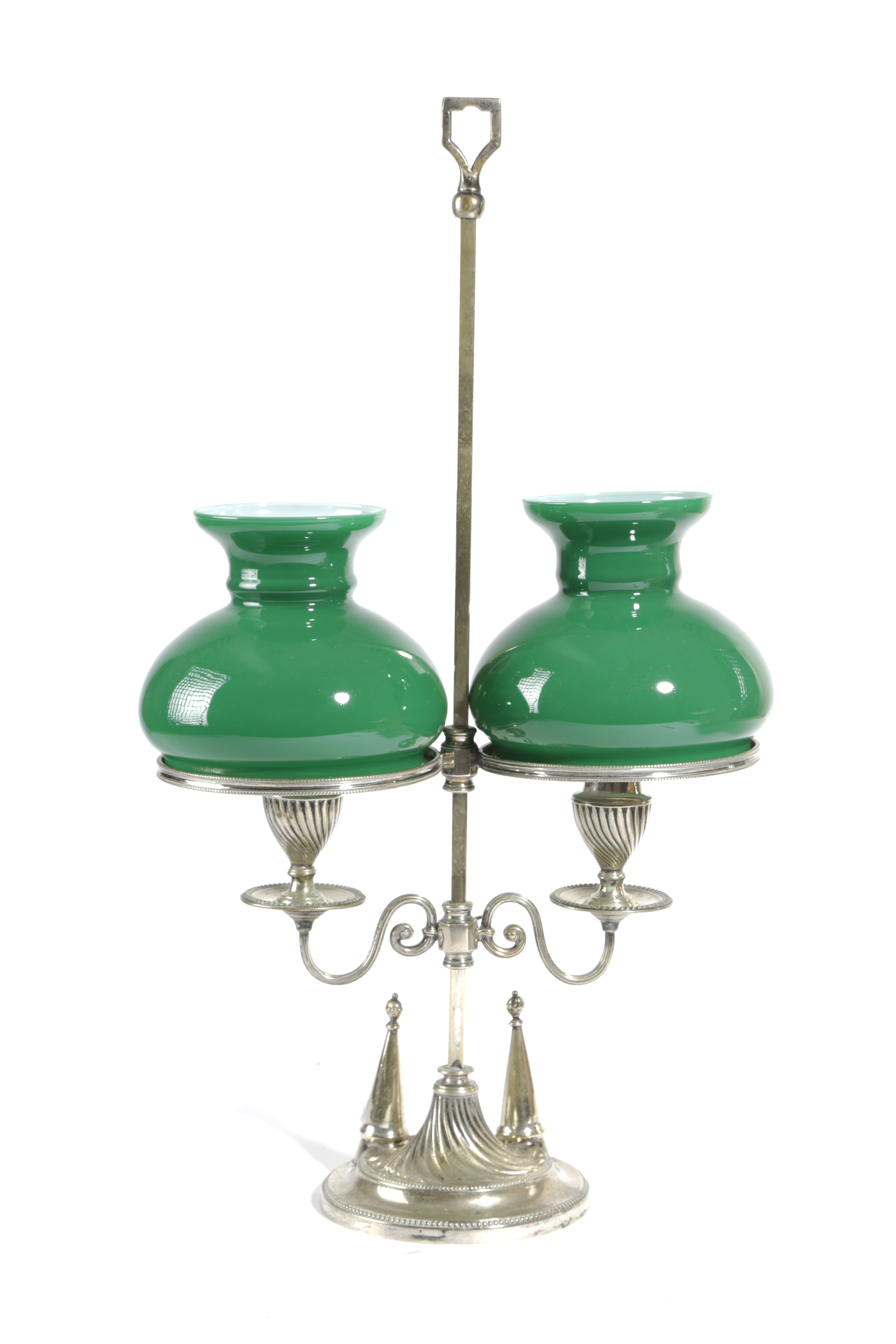 with twin green glass adjustable shades, above a pair of urn shaped nozzles, with an adjustable scroll arm and a pair of snuffers