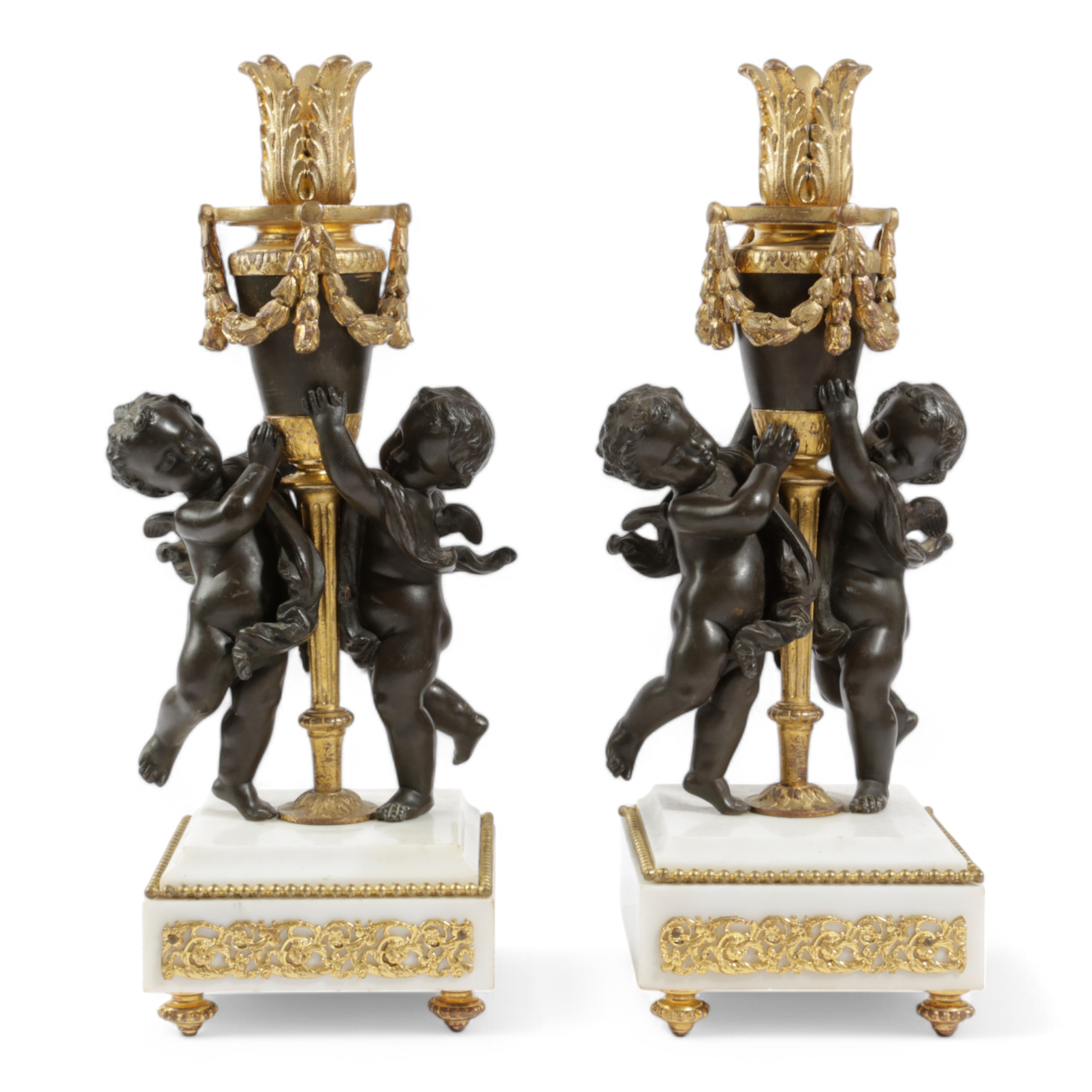 each modelled with a pair of cherubs supporting and urn with laurel swags and standing on a white marble base (2)