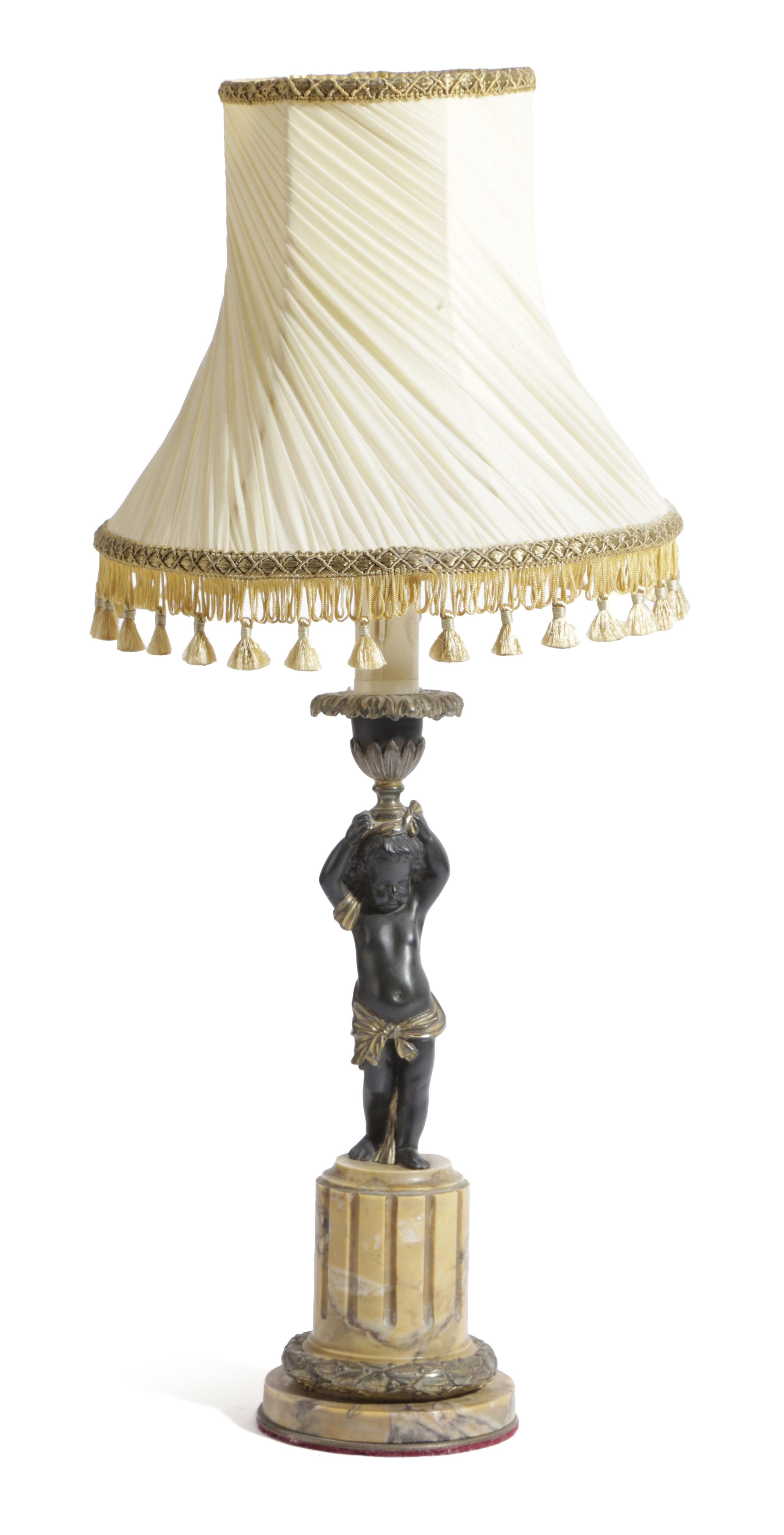 modelled supporting an urn, on a Siena marble and gilt bronze column plinth, fitted for electricity, with shade