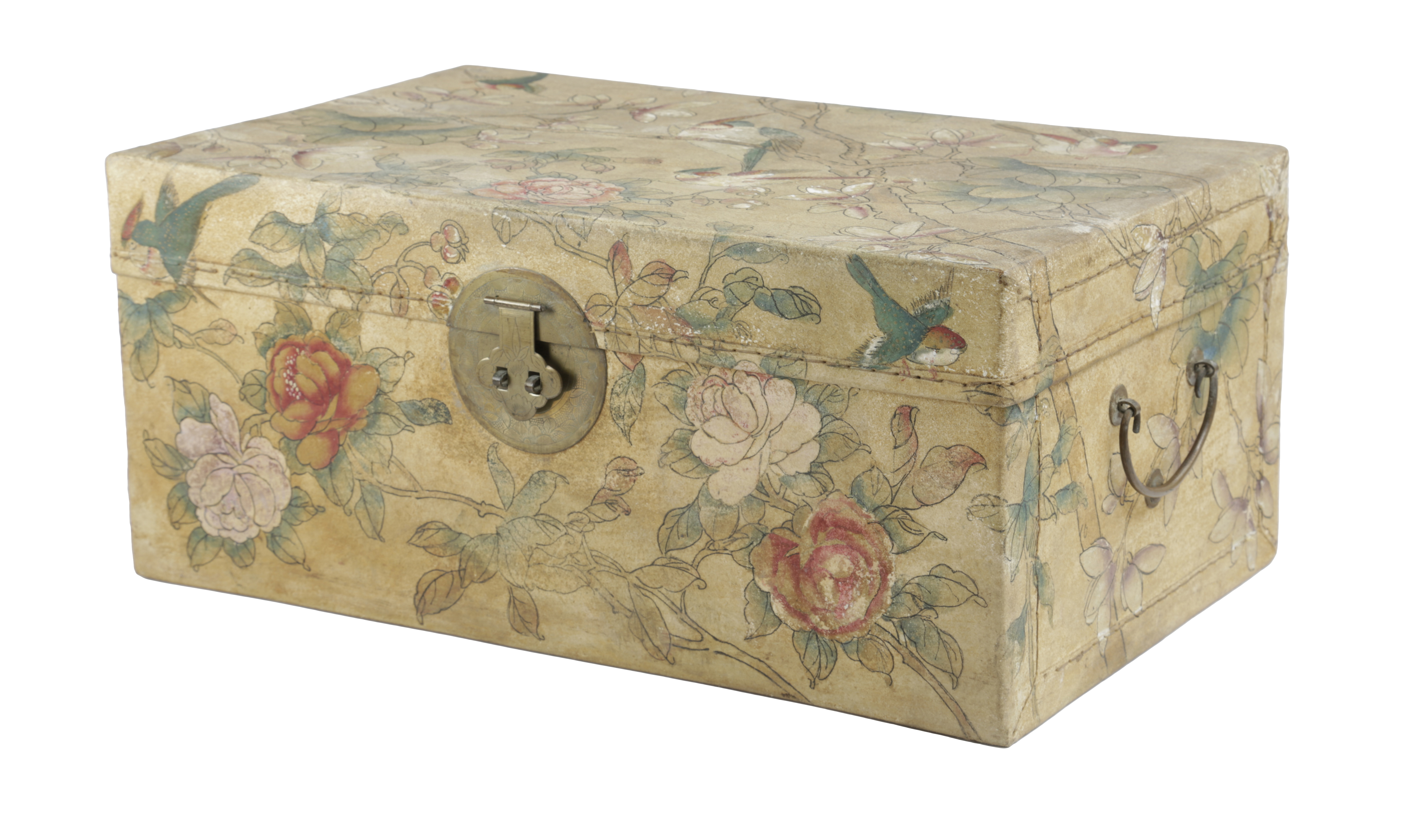 decorated with exotic birds amongst flowers, with a blue silk lined interior