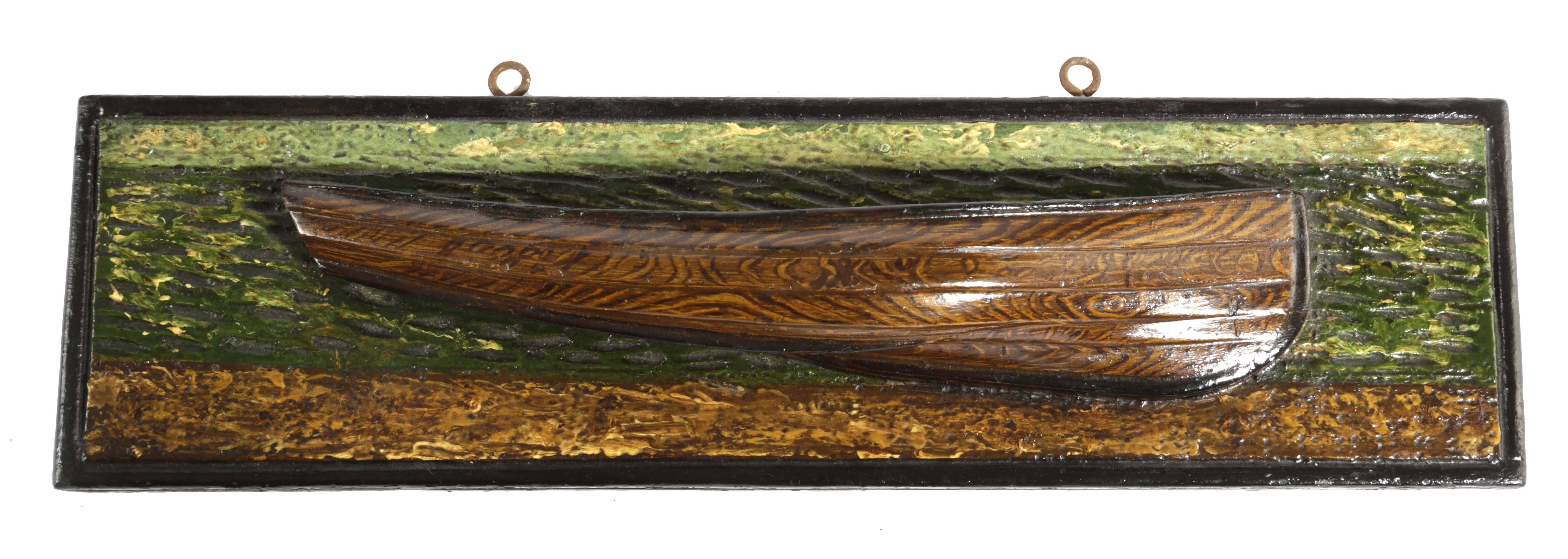 the wooden hull with painted decoration and set on a beach, the verso inscribed in pencil 'Minnie 1880', with suspension rings for hanging