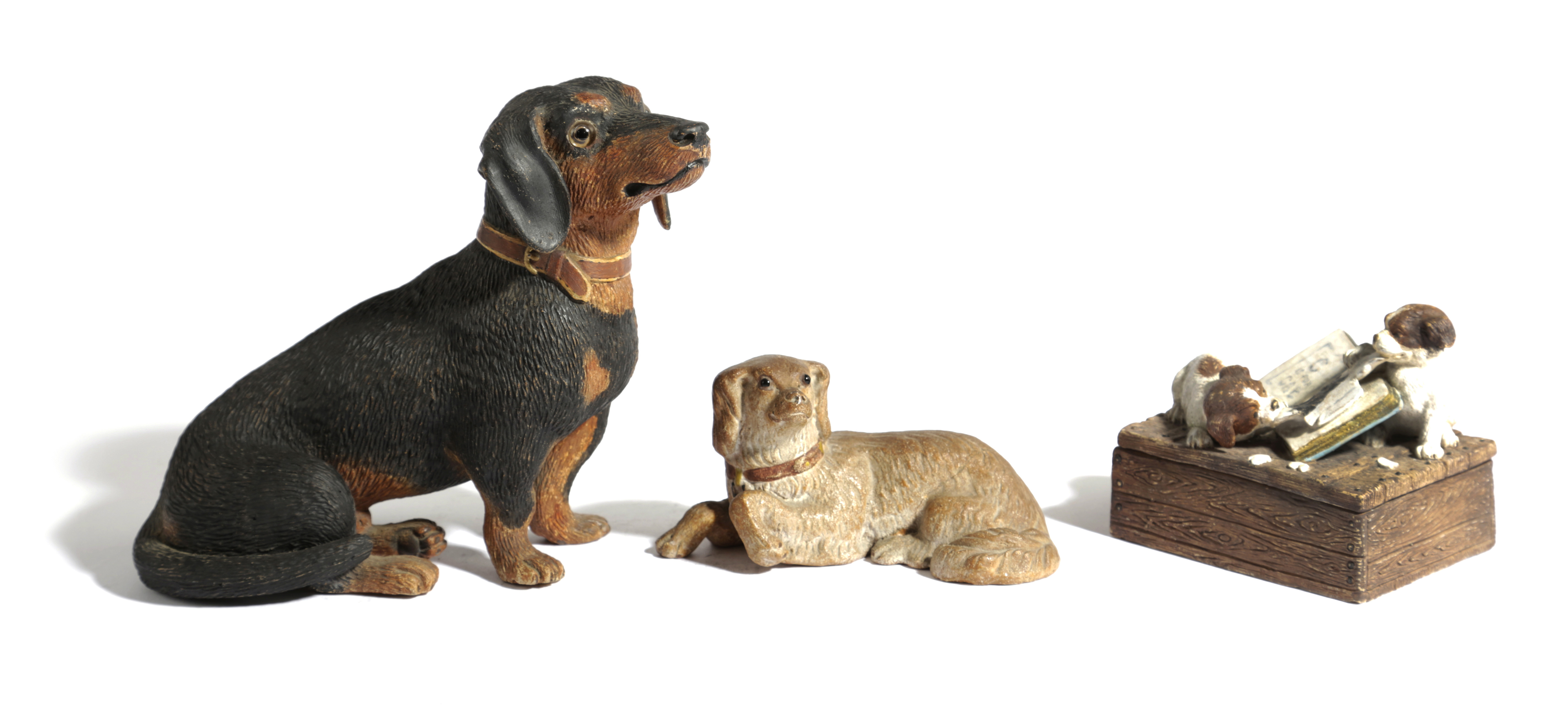 with glass eyes, together with a model of a spaniel and a box, the cover with two puppies playing with a book