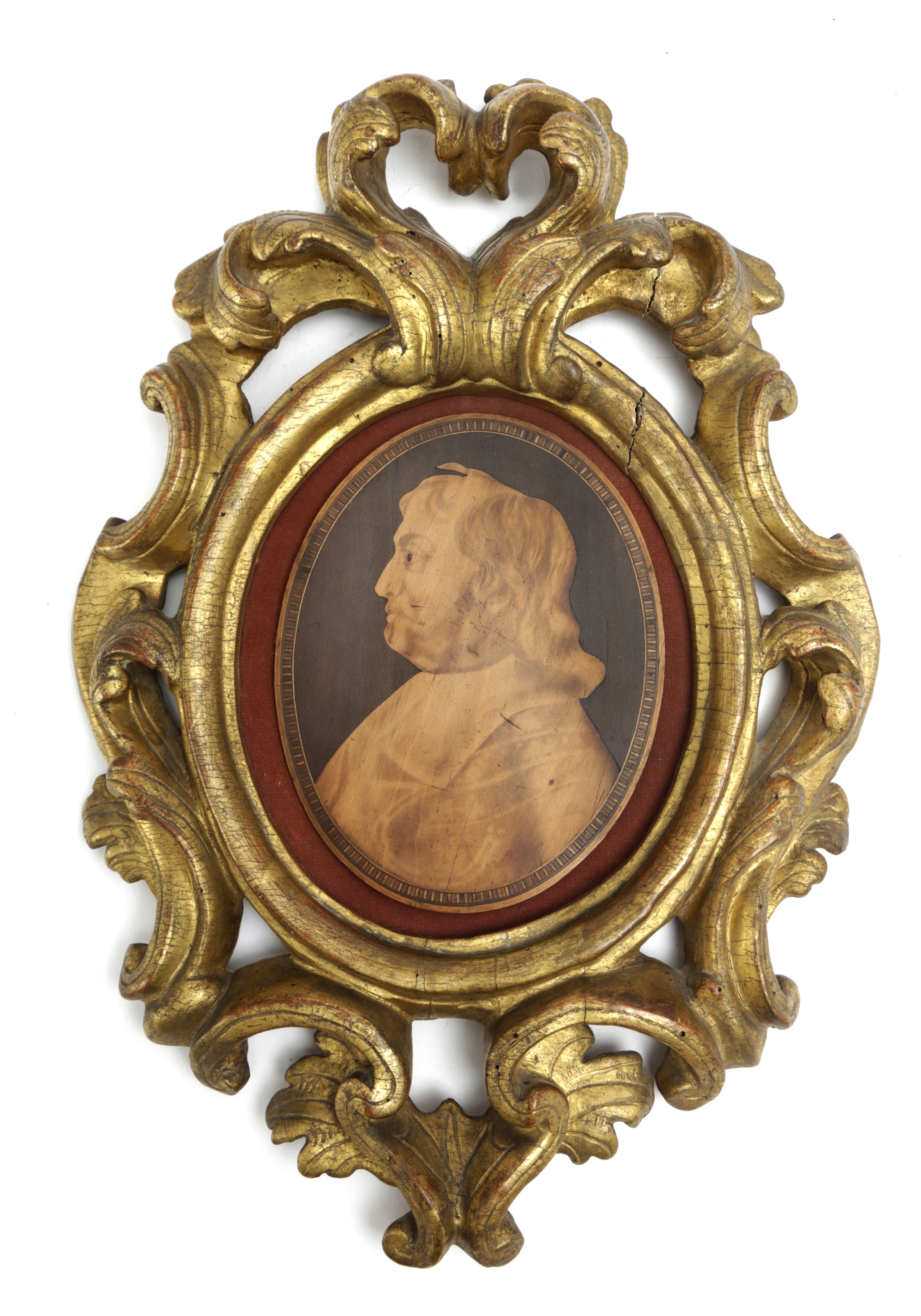 facing left, inside an inlaid border, in a Florentine style giltwood frame