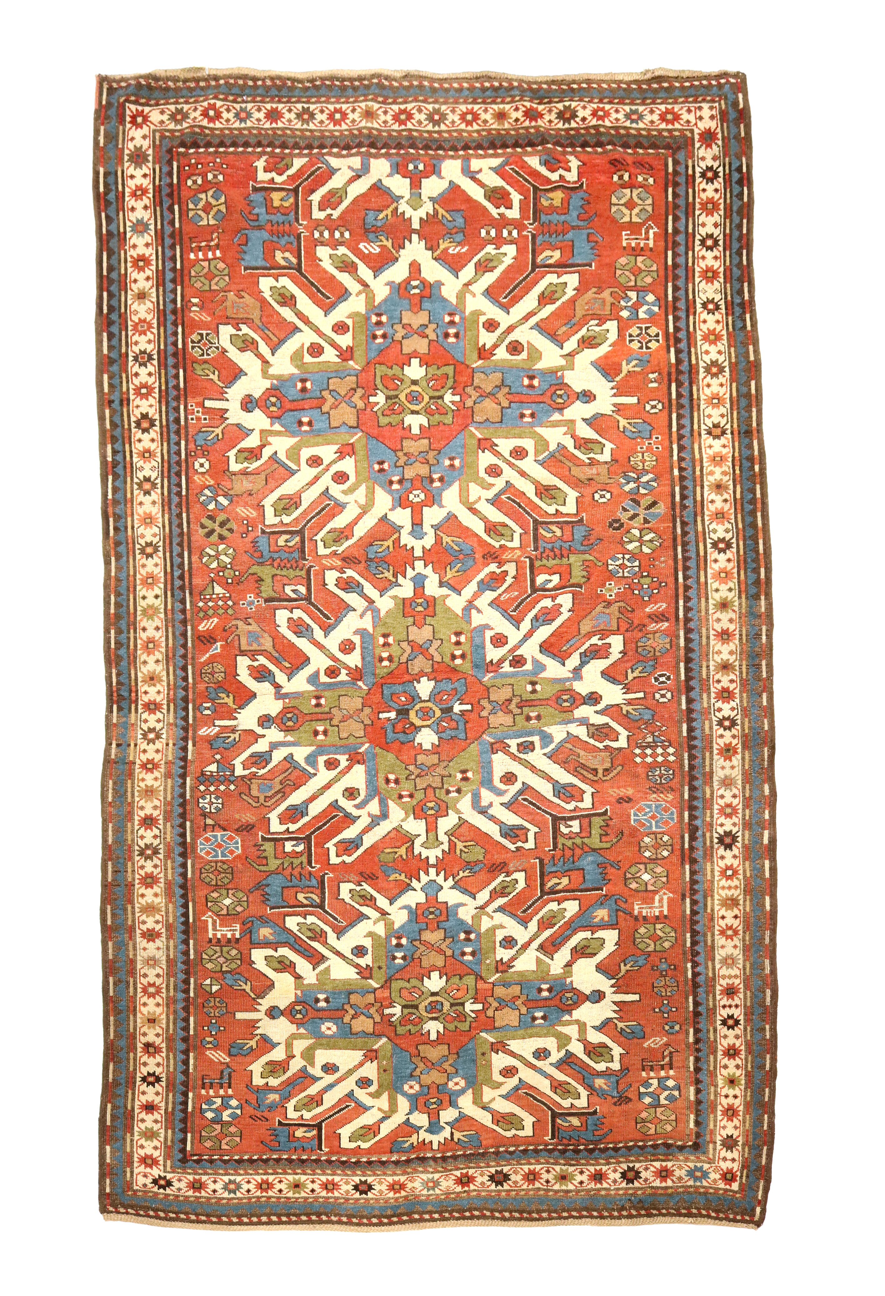 the deep terracotta field with three typical ivory and olive green medallions flanked by tribal and zoomorphic devices enclosed by ivory harshang borders flanked by barber poles and 'saw tooth' guard stripes