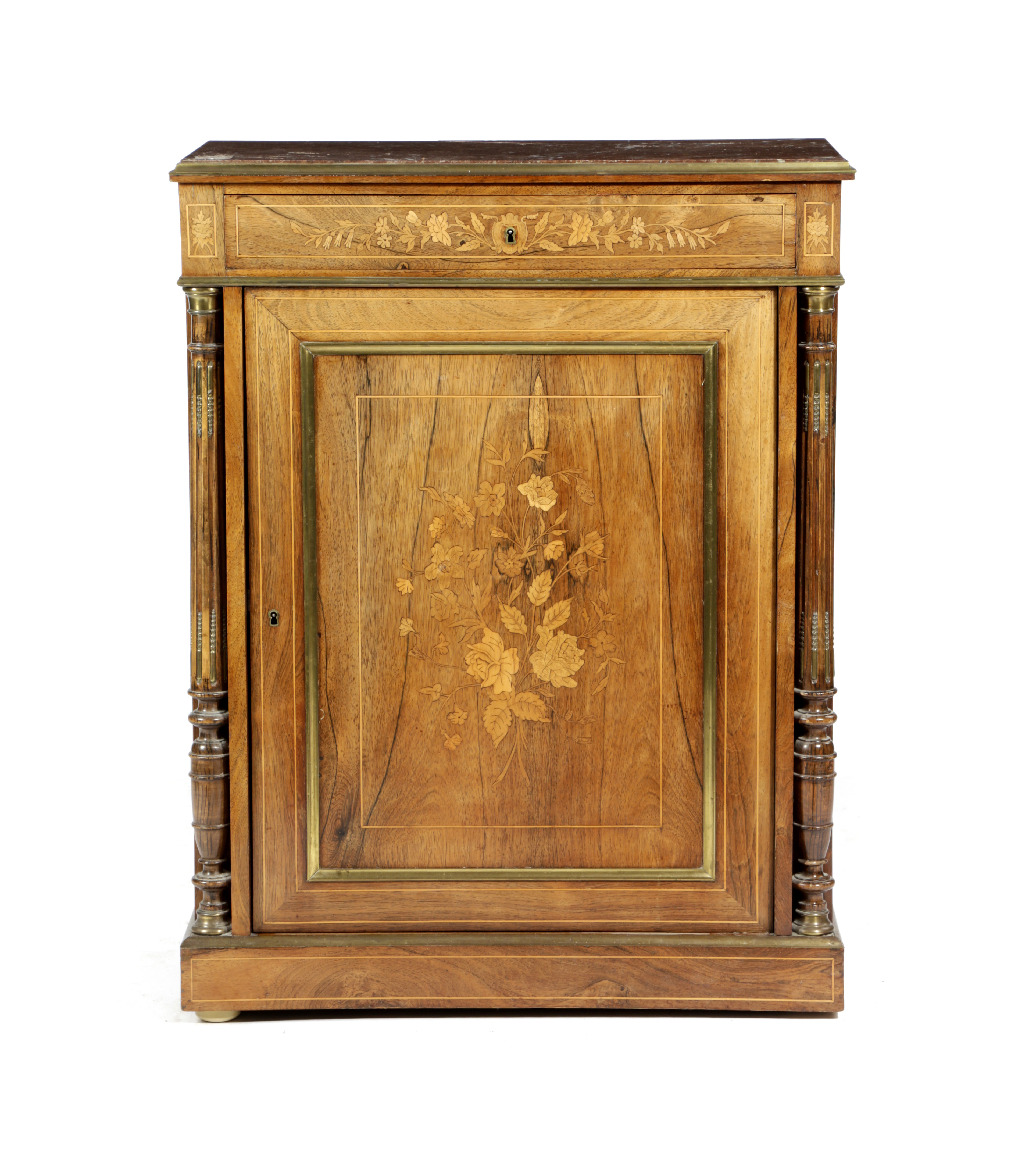 with brass mounts and a marble top, the frieze drawer above a panelled door enclosing shelves, originally on turned feet, now off but present