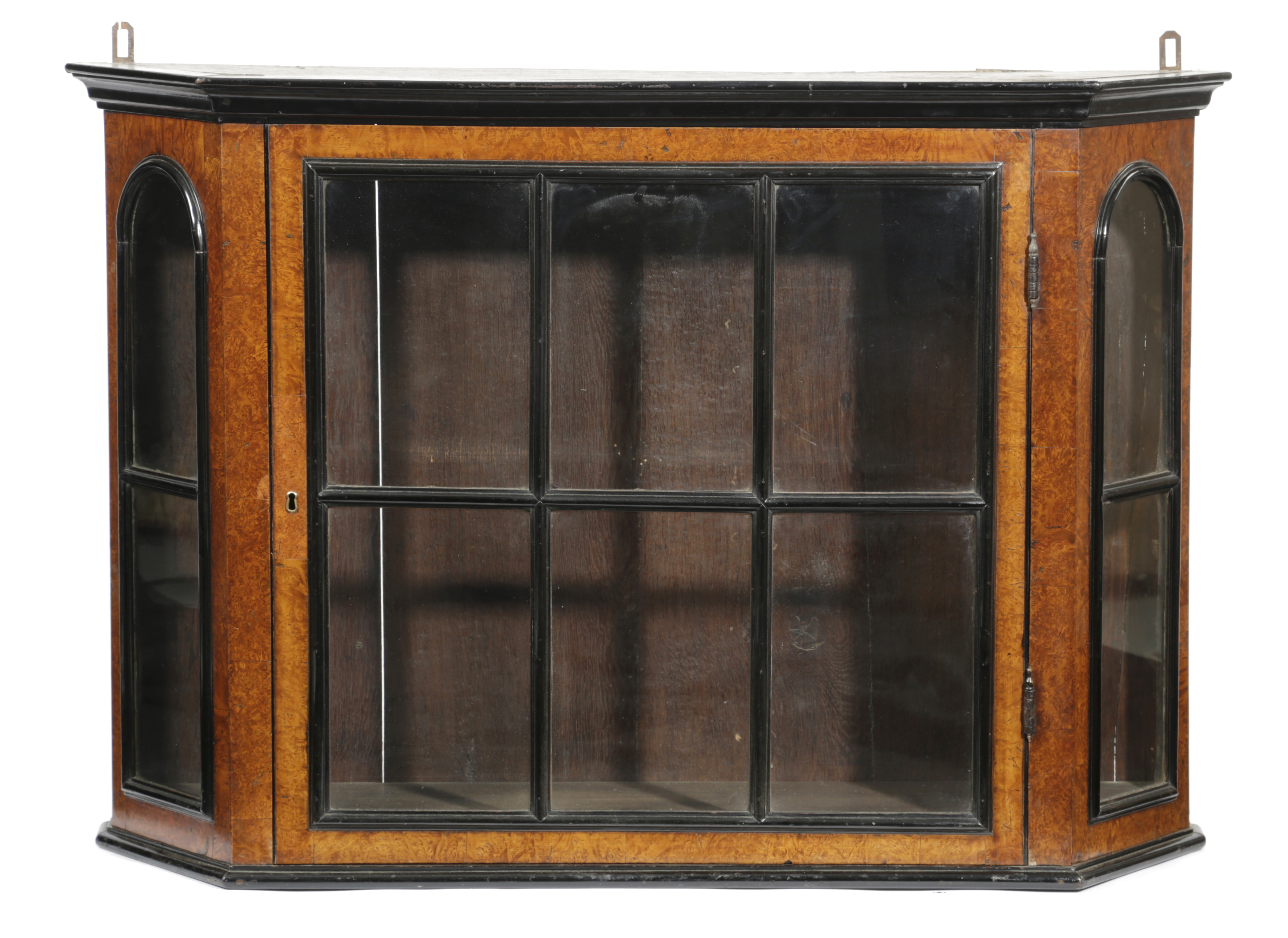 A VICTORIAN AMBOYNA AND EBONISED HANGING WALL CABINET