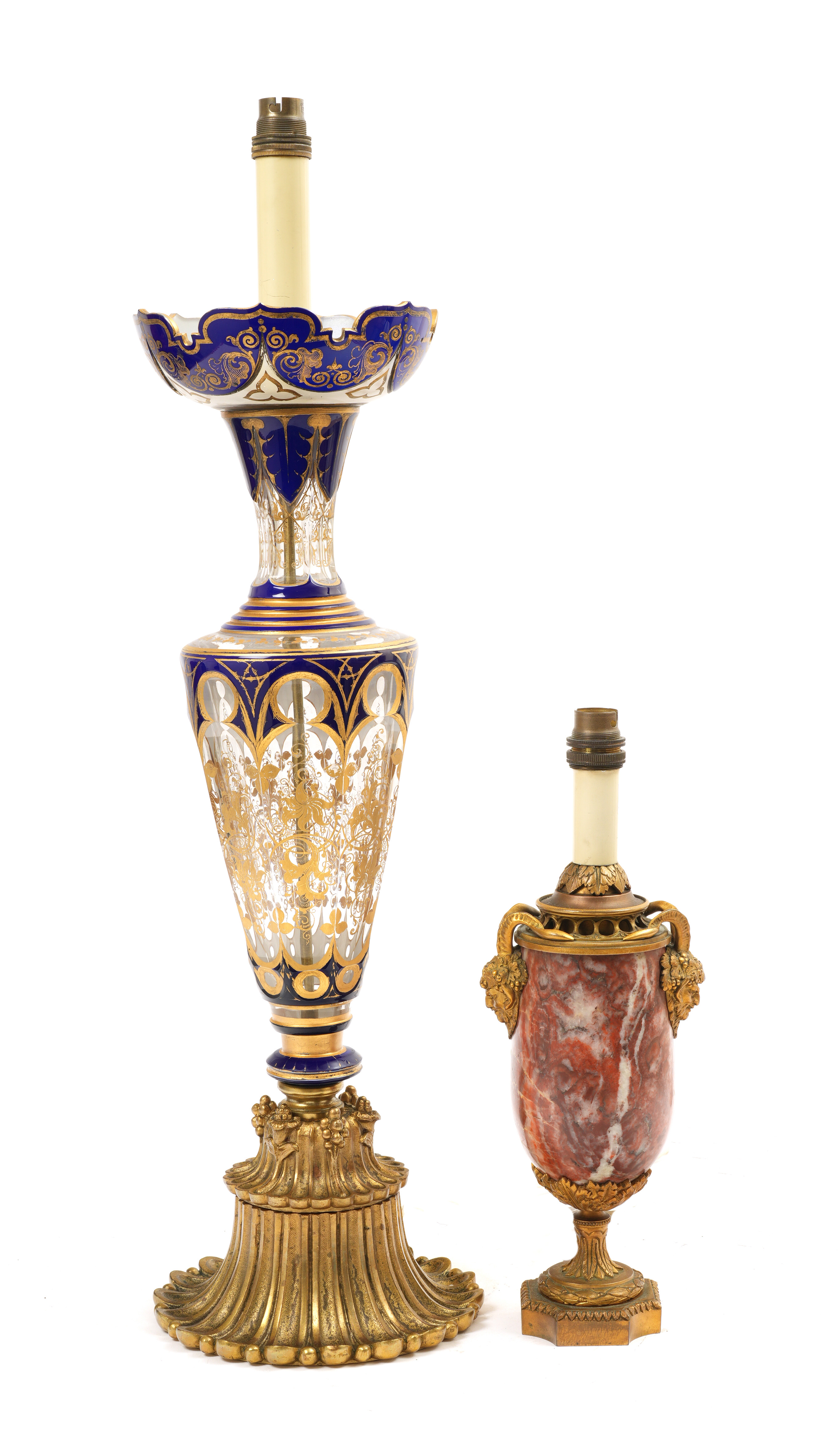 of inverted baluster form in blue cut through to clear with gilt highlights on a reeded flowerhead shaped foot, together with a pink marble and gilt metal mounted table lamp, with Bacchanalian satyr head handles, both fitted for electricity (2)