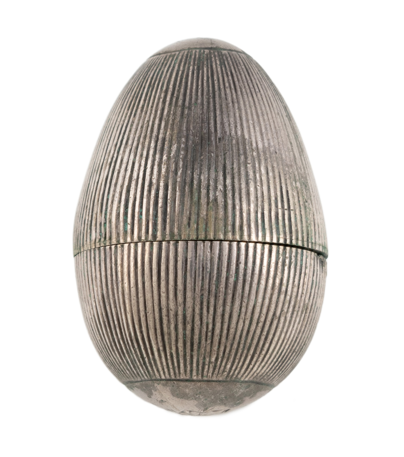 egg form with fluted decoration, an engraved flower to the underside of the base, gilded interior and a pull-out steel grater, length 5.4cm, approx. weight 1.1oz.