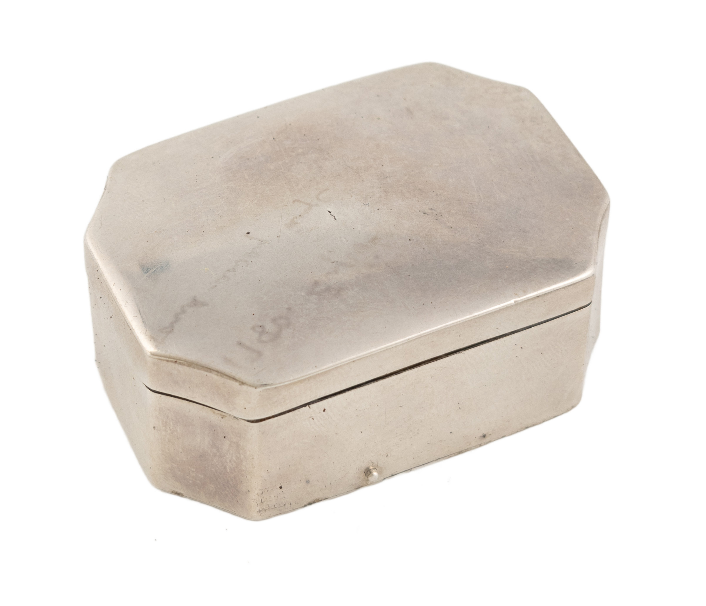 plain rectangular form with canted corners, hinged cover and base with a grater to the interior, length 5.2cm.