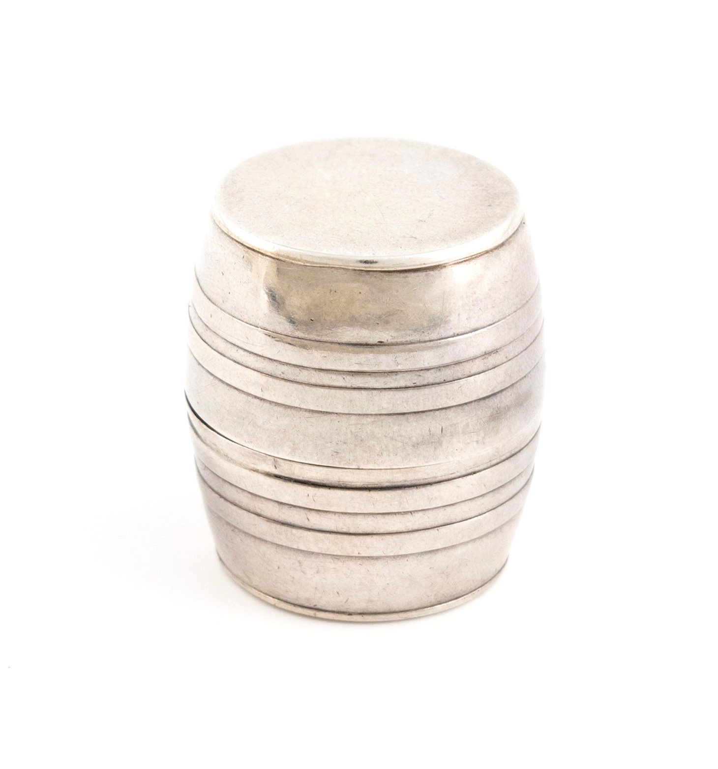 barrel form with band decoration, screw-off cover and to the interior a pull-off steel grater, height 2.8cm, approx. weight 0.5oz.