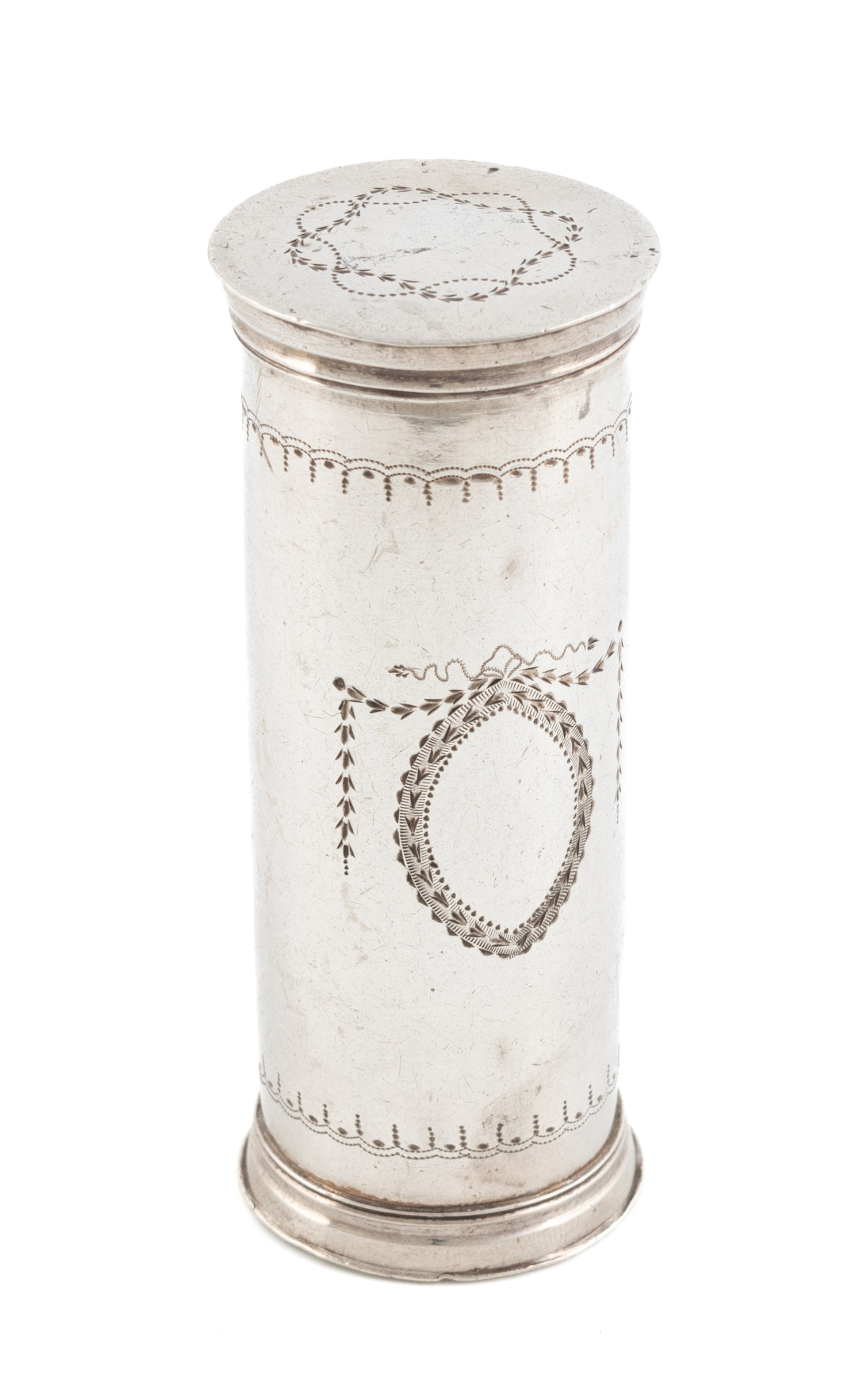 cylindrical form, engraved decoration, vacant shield cartouche, pull-off cover and pull-out steel grater, length 7.9cm, approx. weight 1.4oz.