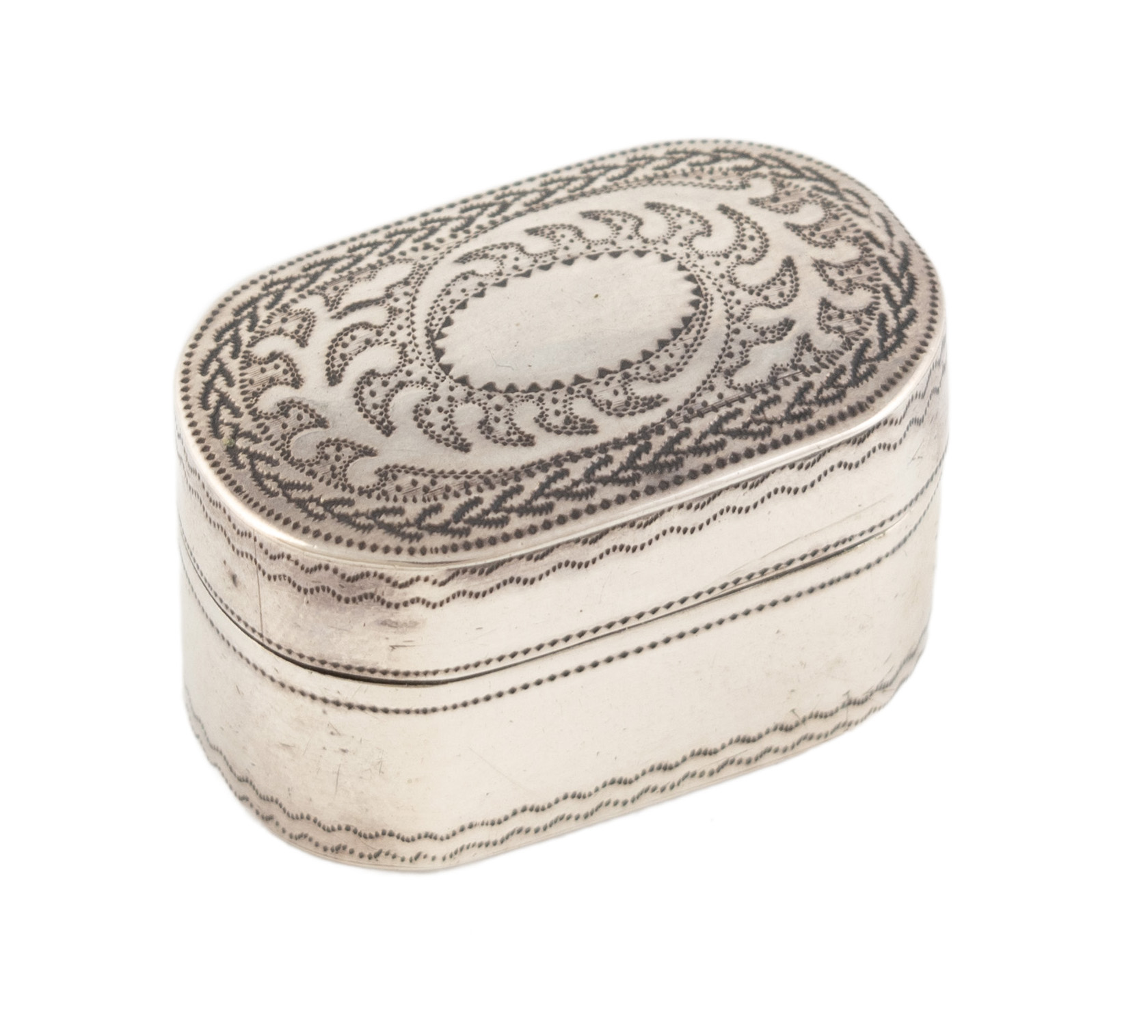 rounded rectangular form with engraved decoration, the interior with a hinged steel grater, length 3.6cm, approx. weight 0.5oz.