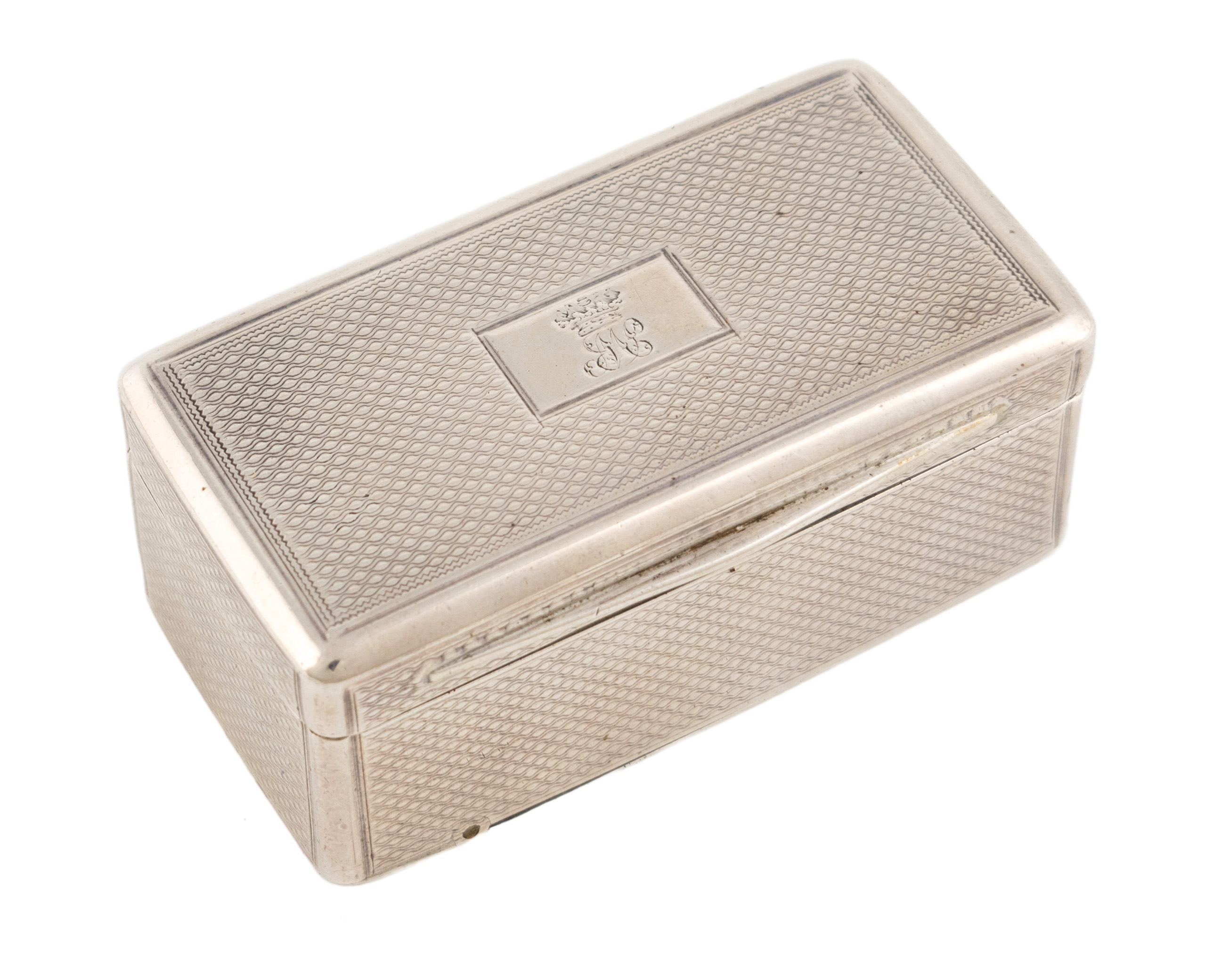 rectangular form with engine-turned decoration, the cover with engraved crowned initials, hinged base, the interior with a steel grater, length 6.6cm, approx. weight 2.8oz.