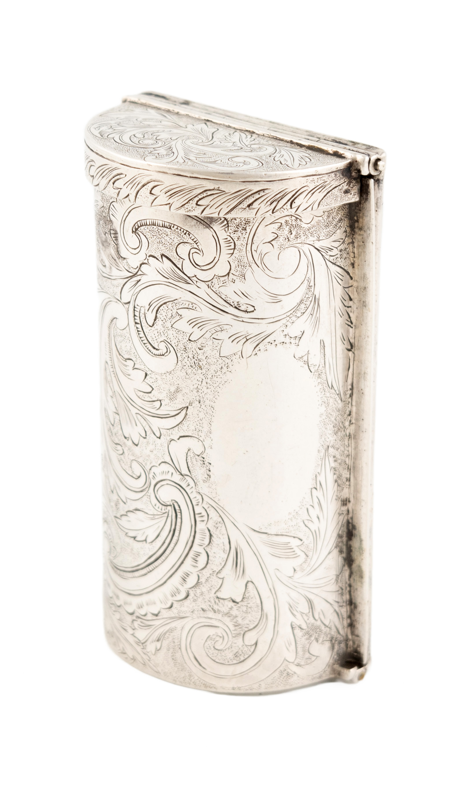 semi-circular form, the hinged cover and side engraved with scroll foliate decoration, with a steel grater to the interior, length 6.8cm, approx. weight 2.1oz.