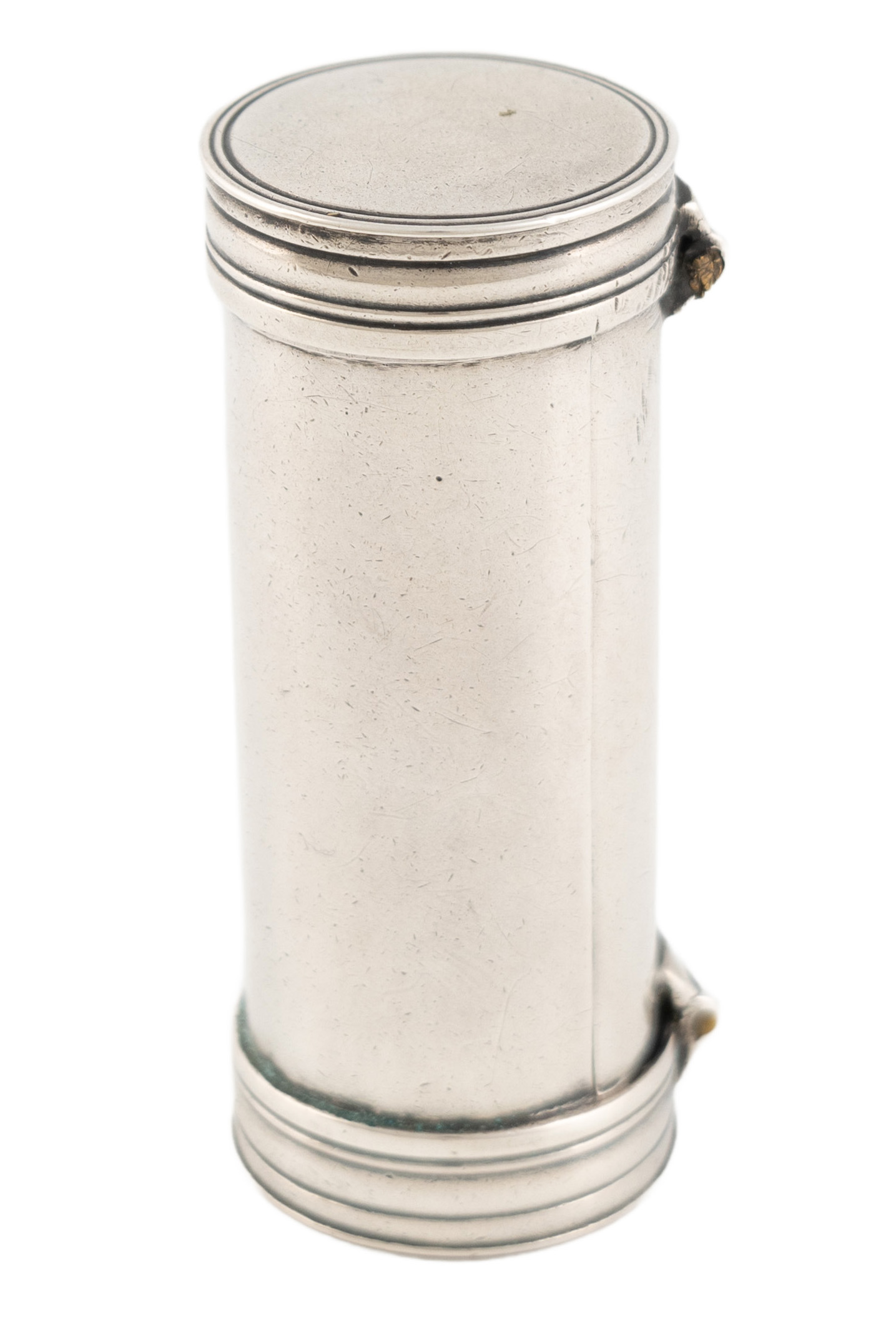 oval cylindrical form, hinged cover and side, the interior with a steel grater, length 5.8cm, approx. weight 1.2oz.