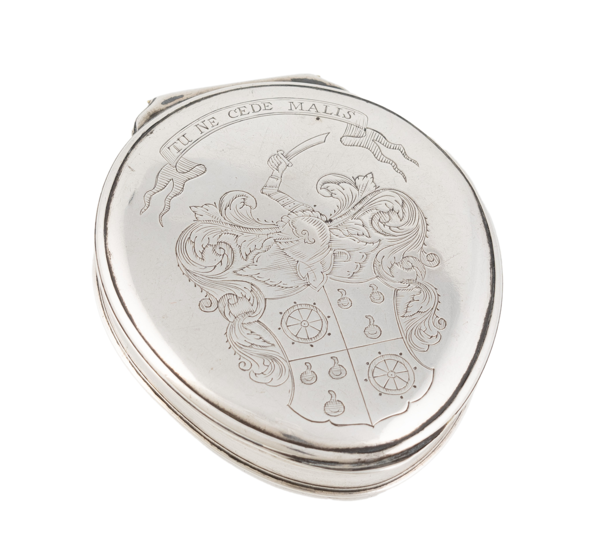 plain mounts, the hinged cover engraved with an armorial, length 6.7cm.